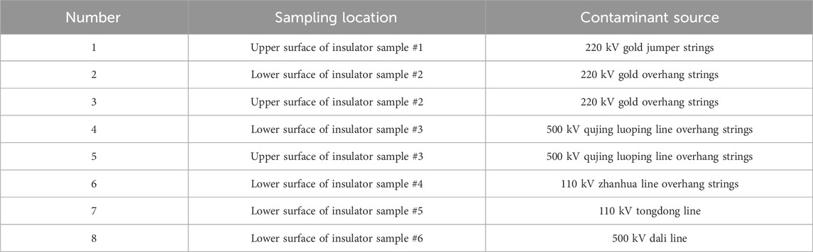 Considering the observed differences in contamination distribution, particle morphology, and the degree of pollutant accumulation on the two insulator samples, sampling was performed at multiple locations on each insulator to comprehensively and accurately characterize the surface contamination. The sampling details are summarized in Table 2.