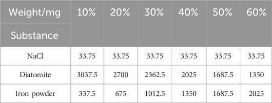 3. Contamination application: NaCl, diatomite, and iron powder with a particle size of 10 μm were weighed according to the experimental design. The area of the glass plate was 675 cm2, and the non-soluble deposit density (NSDD) was maintained at 5 mg/cm2 for all specimens, while the equivalent salt deposit density (ESDD) was set to 0.05 mg/cm2. The iron powder proportion was varied at 10%, 20%, 30%, 40%, 50%, and 60%. The weight configuration of various substances is shown in Table 4. After dissolving and stirring, the mixture was applied uniformly to the surface of the glass plate and air-dried for 24 h to form a stable dry contamination layer.