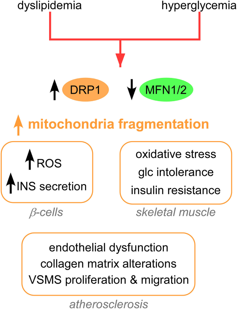 In summary, we know that many of the clinical complications of T2D are associated with mitochondrial fragmentation. We also know that tipping the balance toward increased mitochondrial fragmentation in mice leads to models of T2D. Furthermore, blocking DRP1 (or increasing MFNs) ameliorated hyperglycemia, dyslipidemia, and atherosclerosis in T2D models. Less clear are the mechanisms of alterations in expression and/or activity of DRP1/MFNs. Up to date, most of the studies have shown correlation between the hallmarks of T2D and increased fragmentation of mitochondria (Table 1). However, more studies should focus on understanding the spatiotemporal regulation of DRP1 and MFN1/2 levels during the natural progression of T2D. In this context, there are a number of open questions. For example, are there alterations on the regulation of DRP1/MFNs at the transcriptional, translational, or posttranslational level? Are DRP1/MFNs regulated by insulin, glucose, FFA signaling pathways? What are the tissue- and cell-specific differences in the regulation of mitochondrial shape in T2D? Identifying such molecular pathways controlling DRP1/MFN alterations in T2D might enable therapeutic efforts in prediabetic patients to prevent full-blown settlement of the disease.