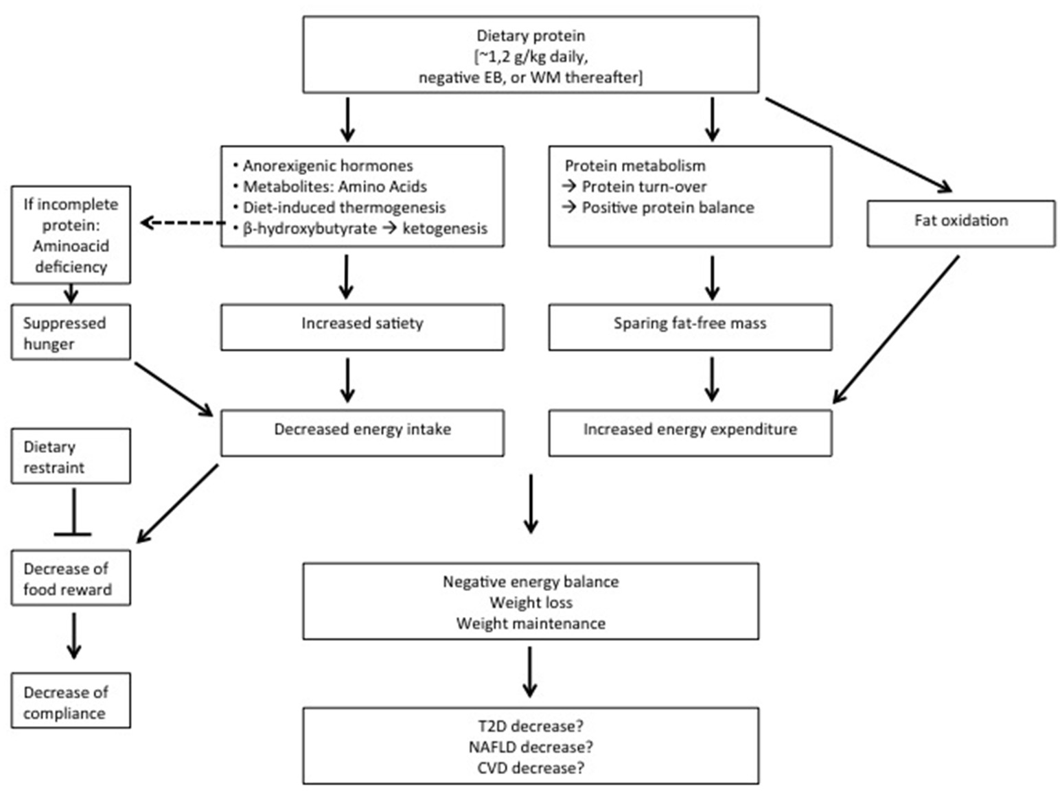 Dietary protein is effective for body-weight management, in that it promotes satiety, energy expenditure, and changes body-composition in favor of fat-free body mass. With respect to body-weight management, the effects of diets varying in protein differ according to energy balance. During energy restriction, sustaining protein intake at the level of requirement appears to be sufficient to aid body weight loss and fat loss. An additional increase of protein intake does not induce a larger loss of body weight, but can be effective to maintain a larger amount of fat-free mass. Protein induced satiety is likely a combined expression with direct and indirect effects of elevated plasma amino acid and anorexigenic hormone concentrations, increased diet-induced thermogenesis, and ketogenic state, all feed-back on the central nervous system. The decline in energy expenditure and sleeping metabolic rate as a result of body weight loss is less on a high-protein than on a medium-protein diet. In addition, higher rates of energy expenditure have been observed as acute responses to energy-balanced high-protein diets. In energy balance, high protein diets may be beneficial to prevent the development of a positive energy balance, whereas low-protein diets may facilitate this. High protein-low carbohydrate diets may be favorable for the control of intrahepatic triglyceride IHTG in healthy humans, likely as a result of combined effects involving changes in protein and carbohydrate intake. Body weight loss and subsequent weight maintenance usually shows favorable effects in relation to insulin sensitivity, although some risks may be present. Promotion of insulin sensitivity beyond its effect on body-weight loss and subsequent body-weight maintenance seems unlikely. In conclusion, higher-protein diets may reduce overweight and obesity, yet whether high-protein diets, beyond their effect on body-weight management, contribute to prevention of increases in non-alcoholic fatty liver disease NAFLD, type 2 diabetes and cardiovascular diseases is inconclusive.