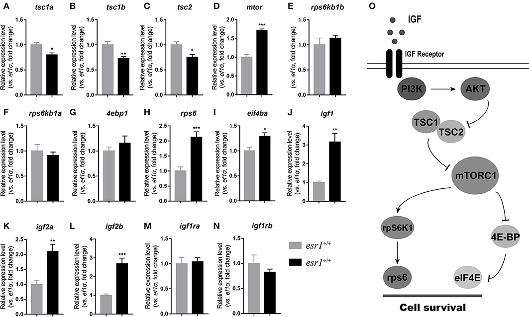 Figure 6. IGF system and mTOR signaling pathway in esr1 mutant female zebrafish. (A–I) The relative expression levels of mTOR signaling pathway genes in the ovaries of wild-type and esr1 mutant zebrafish at 90 and 180 dpf. (J–N) The relative expression levels of igf /igfr genes in the ovaries of wild-type and esr1 mutant zebrafish at 90 and 180 dpf. The mRNA levels were normalized to ef1a. Average mRNA levels in the ovaries of wild-type were defined as 1.0. (*P < 0.05; **P < 0.01; ***P < 0.001; Mean ± SEM). (O) Diagrammatic sketch of mTOR signaling pathway.