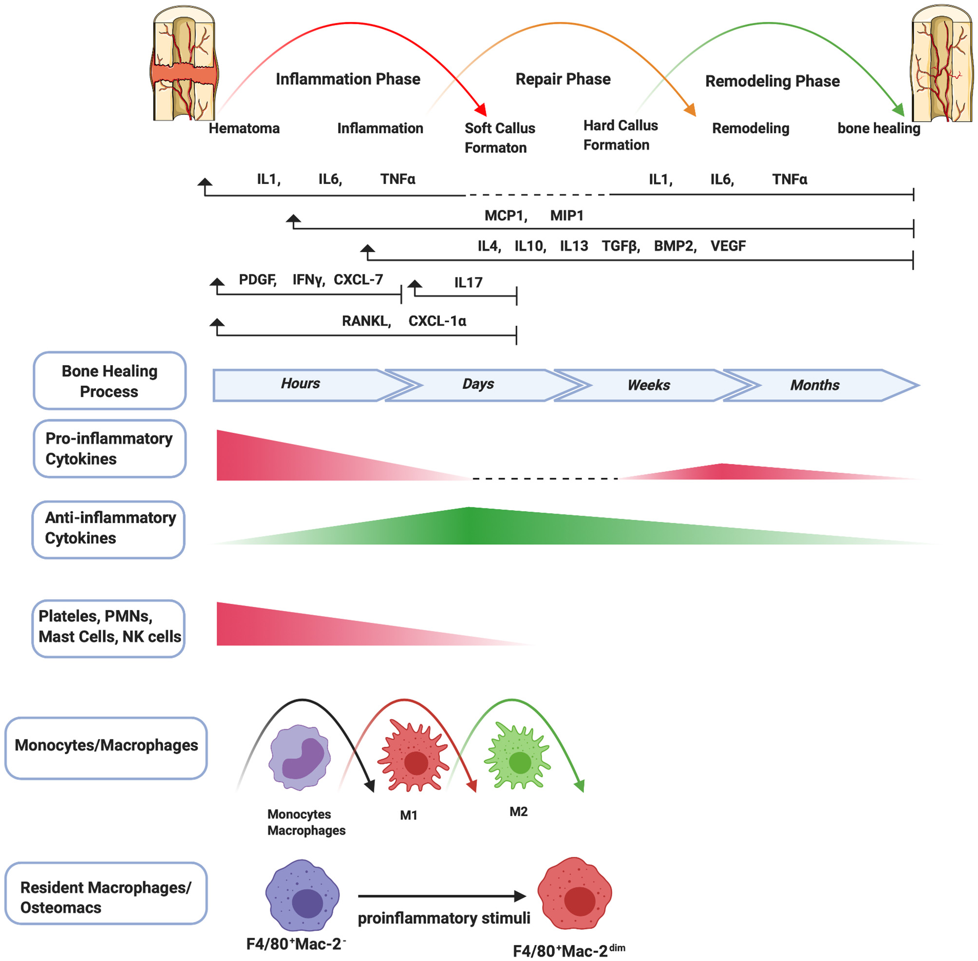 Schematic summary of the stages of bone healing and the temporal pattern of the relative immune cells and cytokines/growth factors expression. Bone healing can be viewed as a three-stage biological phase (inflammation, repair, and remodeling) which can be further divided into six main sub-steps: hematoma, inflammation, soft callus formation, hard callus formation, remodeling, bone healing. After fracture, immune cells including PMNs, NK cells, mast cells, and platelets (platelets are not truly cells as they have no nuclei) are activated in the early stage of the inflammation and the secreted cytokines/chemokines subsequently recruit and activate monocytes/macrophages to further play important roles throughout this process. The pro-inflammatory cytokines including IL1, IL6, TNFα are essential signals during the early stages of bone fracture. In addition, TNFα increases again in the late repair phase, and several pro-inflammatory cytokines (e.g., IL1, IL6, TNFα) are highly expressed in the remodeling phase. The control switch of expression patterns from a pro-inflammatory to an anti-inflammatory response (IL4, IL10, IL13) in the late stages of inflammation is critical to fracture repair.