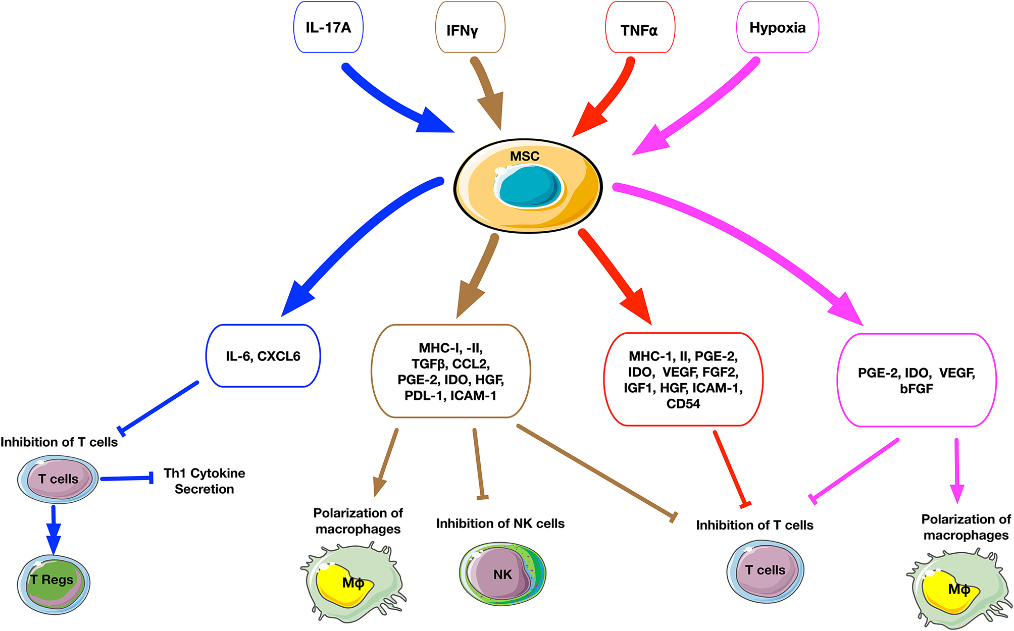Schematic summary of the cellular and molecular effects after preconditioning of MSCs. The upper small rectangle boxes depict the different stimuli used to precondition MSCs. The middle level boxes indicate the upregulation of cytokines and chemokines by MSCs after stimulation. The effects of preconditioned MSCs on a cellular level are represented on the bottom of the figure. The stimuli factors and their respectively triggered outputs are linked by matched color arrows and boxes. IL17A-preconditioned MSCs increase IL6 secretion and regulatory T cell generation and inhibit Th1 cytokine secretion such as TNFα, IFNγ, IL2, and IL10. IFNγ-preconditioned MSCs promote the secretion of immunomodulatory molecules such as IDO, PGE2, HGF, TGFβ, and CCL2, suppress T cell and NK cell proliferation and polarize macrophages to an M2 phenotype. TNFα-preconditioned MSCs promote the secretion of immunoregulatory mediators such as PGE2, IDO, and HGF, suppress T cell proliferation. Hypoxia-preconditioned MSCs promote the secretion of PGE2, IDO, VEGF, and bFGF, suppress T cell proliferation, and polarize macrophages to an M2 phenotype.