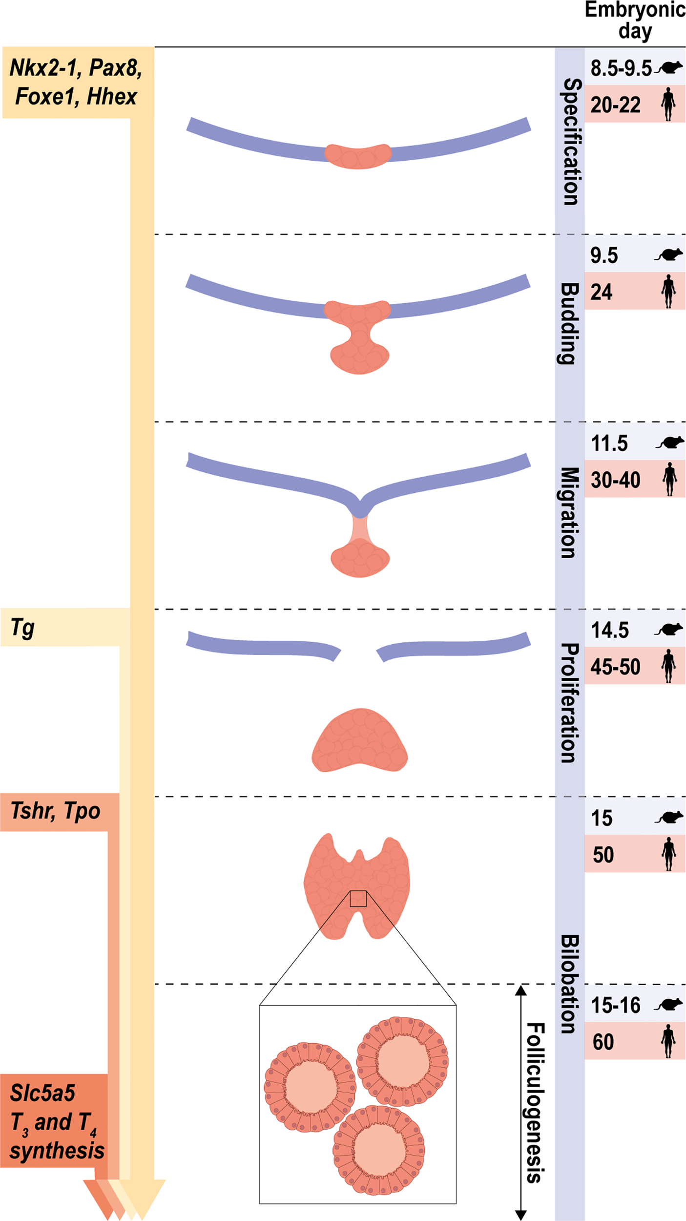 Stages of early thyroid development. Schematic representation of the main steps of thyroid morphogenesis indicating the corresponding embryonic or post-fertilization day in mice and humans, respectively. From an undifferentiated endoderm, the co-expression of Nkx2-1, Foxe1, Pax8 and Hhex defines the specification of thyroid progenitor cells. Arrows on the left represent the initial stage at which the expression of the thyroid transcription factors and their main target genes are first detected. The onset of thyroid hormone synthesis and Slc5a5 expression occurs at the final stage, once folliculogenesis has occurred and the thyroid gland is completely functional.