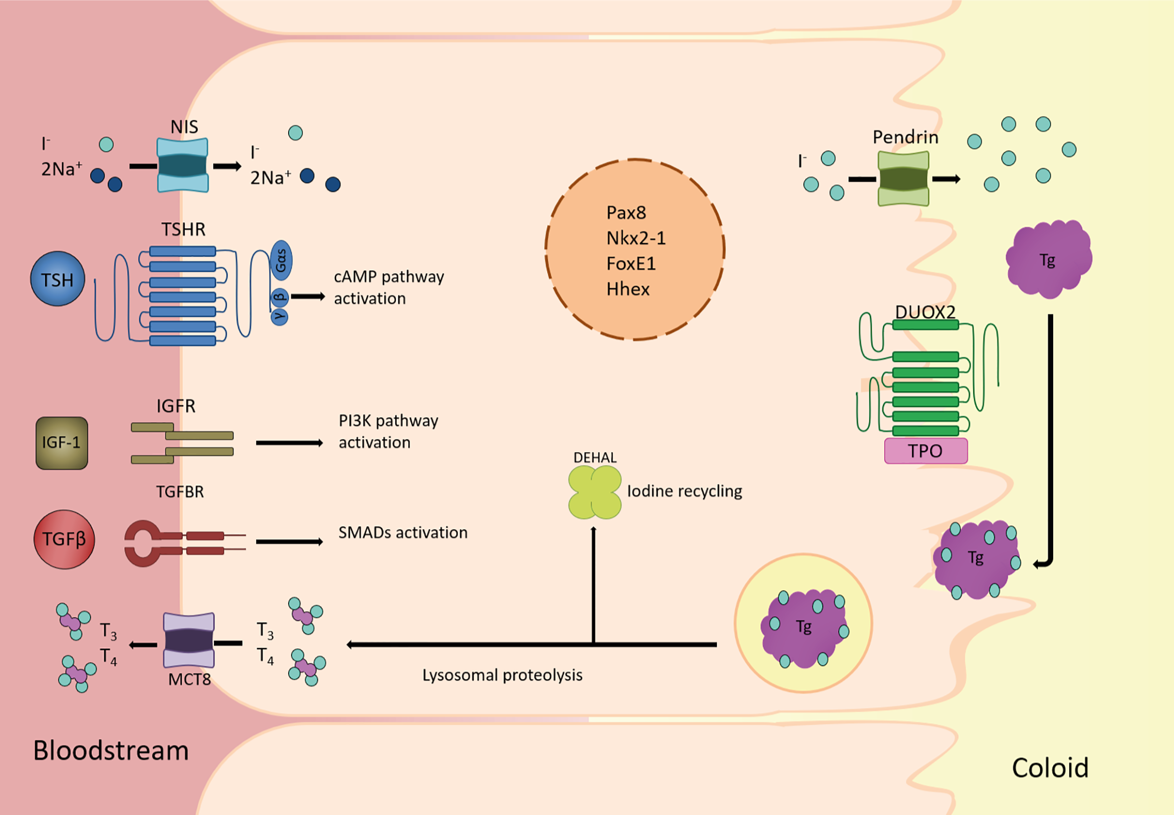 Overview of the main players in thyroid follicular cell function. Schematic diagram of a thyroid follicular cell and the main proteins involved in the synthesis, storage, and release into bloodstream of the thyroid hormones triiodothyronine (T3) and thyroxine (T4). At the basolateral membrane, circulating iodide (I-) is actively taken-up by the Nis symporter. It then passively diffuses to the apical membrane where it is actively transported to the lumen by Pendrin and other transporters. Once I- is oxidized by thyroid peroxidase (Tpo), using H2O2 generated by the oxidase Duox2, tyrosine residues in thyroglobulin (Tg) are iodinated to form mono-iodotyrosine (MIT) and/or di-iodotyrosine (DIT), whose coupling yields thyroid hormones. Colloid droplets rich in Tg are endocytosed into the thyroid follicular cell, where Tg lysosomal proteolysis releases MIT, DIT, T4, and T3. Thyroid hormones are transported to circulation by the monocarboxylate transporter 8 (Mct8), whereas I- from MIT and DIT is recycled by the iodotyrosine deiodinase (Dehal1). All of these processes rely on the co-existence of the thyroid transcription factors Nkx2-1, Foxe1, Pax8 and Hhex, in the nucleus of the thyroid follicular cell, from where they regulate the expression of genes such as Slc5a5, Tpo, Tg and Tshr. Also, in the basolateral membrane, TSH, IGF1 and TGFβ trigger the main pathways involved in adult maintenance of thyroid differentiation by cAMP, PI3K and SMAD activation, respectively.