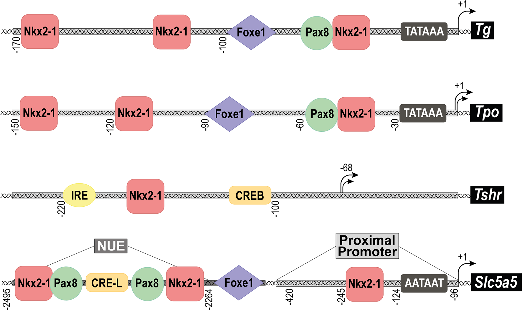Structure of the promoter regions of the main thyroid differentiation genes. Schematic representation of the main transcription factor binding sites found in the promoter regions of the genes: Thyroglobulin (Tg), Thyroid peroxidase (Tpo), TSH receptor (Tshr) and Sodium/iodide symporter (Nis, Slc5a5). In the case of Slc5a5, the proximal promoter, and the Nis Upstream Enhancer (NUE) are separately indicated. Black arrows represent the transcriptional initiation site of each promoter and numbers define its position. The TATA box is indicated as well as the binding sites for transcription factors: Nkx2-1, Foxe1, Pax8, CREB, CRE-L (CRE-Like) and IRE (Insulin Respose Element).