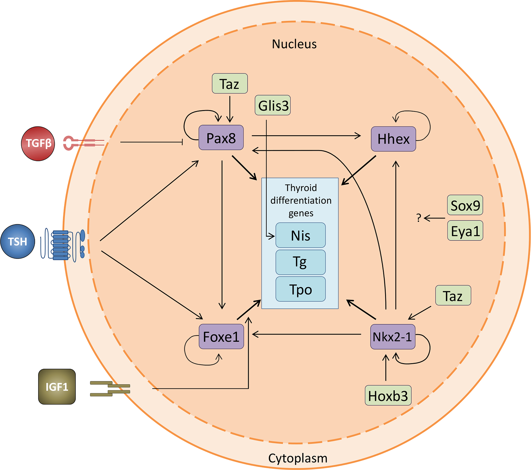 Thyroid transcription factor crosstalk. Relationship between the four thyroid transcription factors and the thyroid differentiation genes, including the interaction with the novel transcription factors involved in thyroid differentiation. Nkx2-1 is regulated by Taz and Hoxb3 and promotes the expression of the other three TTFs. Pax8 regulates the expression of Hhex and Foxe1 and is positively regulated both by TSH and Taz. It is also negatively regulated by TGFβ. Foxe1 is positively regulated by TSH and IGF1. All four TTFs promote the expression of the thyroid differentiation genes Nis (Slc5a5), Tg and Tpo. The effect of Sox9 and Eya1 remains to be fully elucidated. Pointed arrows denote activation while flat arrows indicate inhibition.