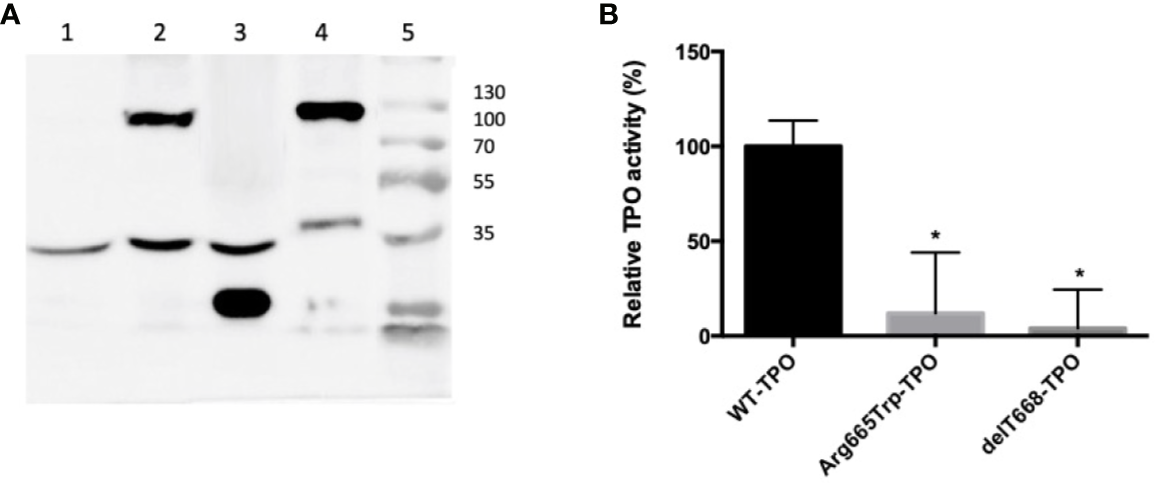 (A) Western blot of HEK293 extracts from cells transfected with wild-type or mutant TPOs. Lane: 1) pCDNA 3.1; Lane 2) Arg665Trp-TPO, 103 kDa; Lane 3) delT668-TPO, 35 kDa; Lane 4) TPO-WT; 103 kDa; Lane 5) molecular weight marker Thermo Scientific Page Ruler (Thermo Scientific, Carlsbad, CA). All strains expressed the endogenous control alpha-tubulin (53 kDa). (B) Extracellular enzymatic activity of HEK293 cells expressing wild-type or mutant TPOs. Enzymatic activity was assessed using the Amplex UltraRed reagent. λEXCITATION = 530 nm and λEMISSION = 560 nm. The values are expressed as a percentage of the TPO-WT transfected cells’ activity (*p < 0.05).
