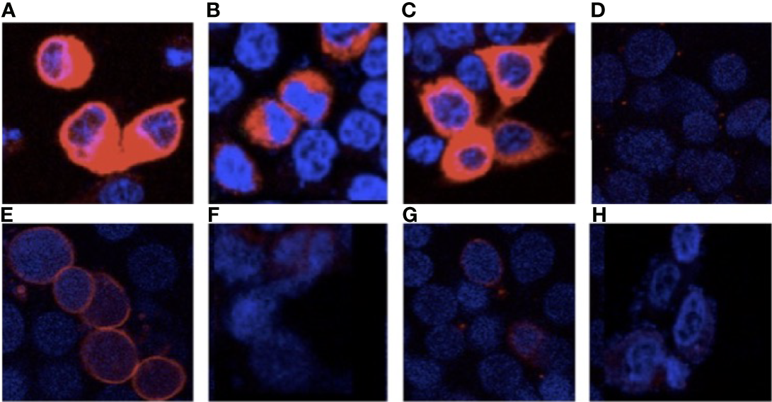 Cellular localization of wild-type and mutant TPOs. Immunofluorescence, using anti-TPO RPE5379- (Abcam) and AlexaFluor 594 (Invitrogen), under permeabilized conditions, Panel (A) TPO-WT, Panel (B) delT668-TPO, Panel (C) Arg665Trp-TPO, and (D) pcDNA and impermeabilized conditions Panel (E) TPO-WT, Panel (F) delT668-TPO, Panel (G) Arg665Trp-TPO, and Panel (H) pcDNA transfected HEK293 cells. Images were acquired with a Leica TCS SP8 confocal microscope at 63× magnification.