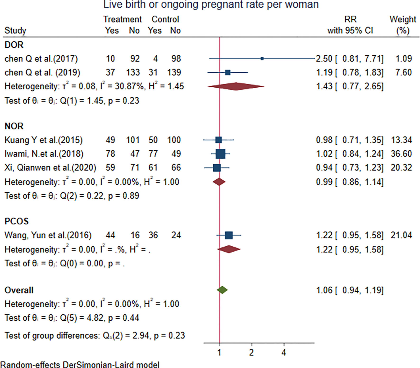 We performed subgroup analysis for different ovarian reserve patients (including DOR, NOR, and PCOS subgroups) and different treatment protocols. We did not analyze publication bias because the number of included literatures was less than 10.
