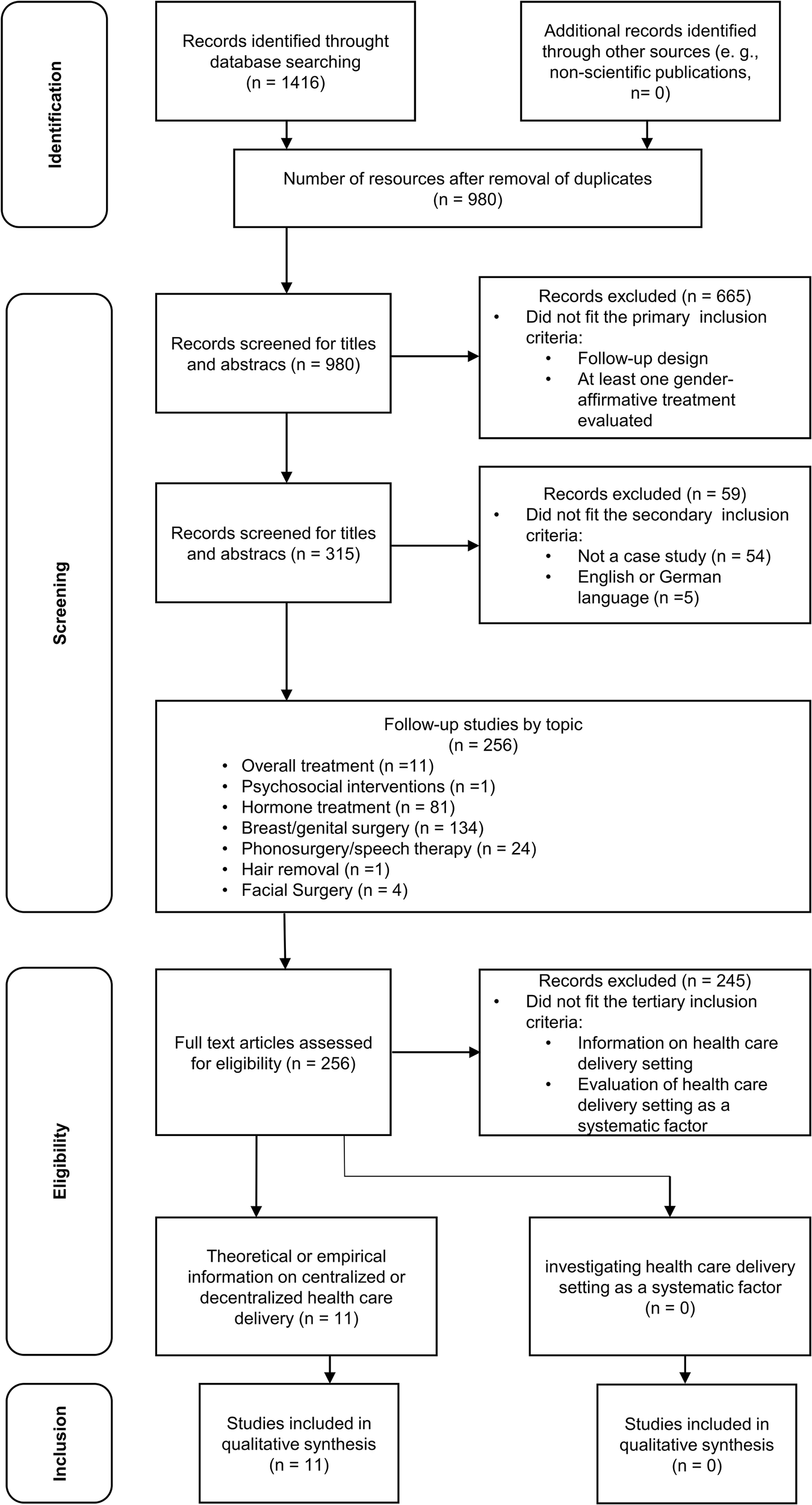 The databases from the different selection steps were sorted based on the evaluated transgender health care service (mental health counseling, hormone therapy, gender-affirming surgery, speech therapy, hair removal) and analyzed further (Tables of the databases after applying the first and second selection criteria are available from the corresponding author upon request). After applying the tertiary selection criteria, the final sample included articles of follow-up studies that were further analyzed, focusing on information concerning (de-)centralized delivery of health care services. Extracted data from the articles included authors, study design, country, participants, evaluated gender-affirming medical treatment, outcomes, and information regarding (de-)centralized delivery of health care services.