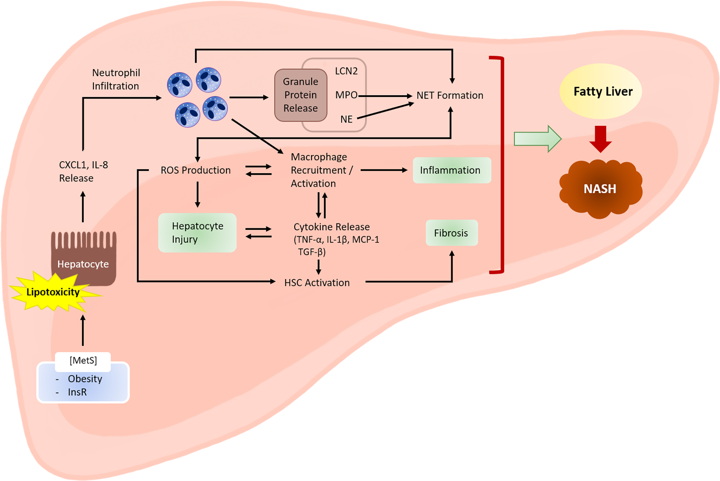 Role of neutrophils in the development of NASH. Metabolic syndrome is often associated with excessive lipid accumulation in the liver. Under these conditions, the probability of hepatocytes being exposed to lipotoxic lipid species, such as fatty acids, ceramides, cholesterol, and sphingolipids, is high. Lipotoxic hepatocytes release neutrophil-recruiting chemokines, including CXCL1 and IL-8. Infiltrating neutrophils exert various actions that facilitate NASH development. Activated neutrophils produce ROS via an oxidative burst that involves the activity of enzymes, such as NADPH oxidase 2. ROS may directly cause hepatocyte injury. ROS also activate and recruit macrophages, which further enhance hepatocyte injury and inflammation by releasing inflammatory cytokines. Cytokines released by macrophages (e.g., transforming growth factor-β) activate hepatic stellate cells (HSCs) and promote fibrosis. Neutrophil-derived ROS also contribute to HSC activation. Neutrophil granule proteins, such as LCN2, MPO, and NE, have increasingly been recognized to contribute to sterile inflammation, although the exact mechanisms through which they contribute to NASH are unclear. NETs mediate inflammation during NASH development through mechanisms that are not yet fully understood. Neutrophil-derived factors such as ROS and granule proteins (e.g., MPO and NE) contribute to NET formation. Hepatocyte injury, inflammation, and fibrosis are the three hallmarks of NASH. MetS, metabolic syndrome; InsR, insulin resistance.