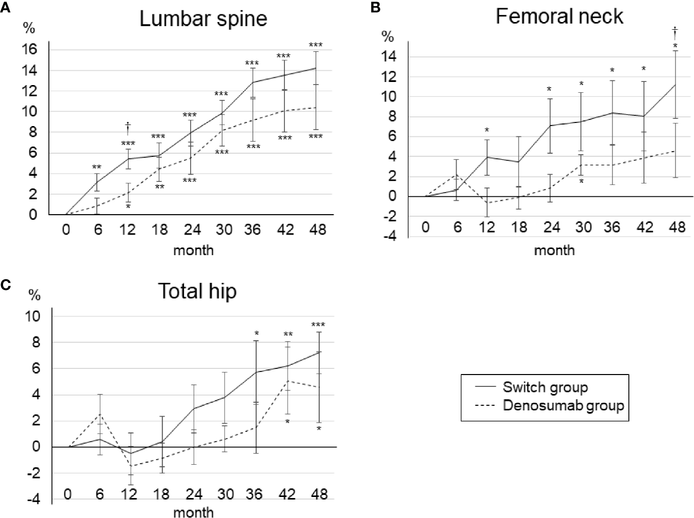 Mean percent changes in BMD from baseline to 48 months in the lumbar spine (A), femoral neck (B), and total hip (C). Error bars: SEM. *p < 0.05, **p < 0.01, ***p < 0.001 vs. baseline. †p < 0.05, denosumab group vs. switch group.