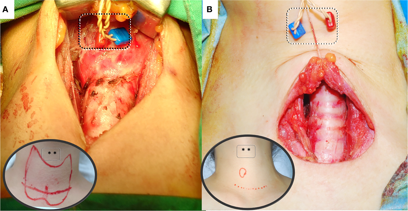 Anterior laryngeal (AL) recording electrode placement for intraoperative neural monitoring. (A) Transcartilage Anterior Laryngeal Recording: Skin flaps are elevated superiorly to expose the thyroid cartilage. Needle electrodes are placed onto the subperichondrium layer of thyroid lamina. Inserting the needle at the anterior margin of the thyrohyoid muscle with a 10- to 15-degree angle from the surface of lamina. (B) Percutaneous Anterior Laryngeal Recording: The needle electrodes are percutaneously inserted and fixed onto the perichondrium layer of thyroid cartilage. It may be applied in surgeries with lower/smaller incision wound or in remote surgery. However, excessive traction may cause percutaneous needle displacement during the surgery.