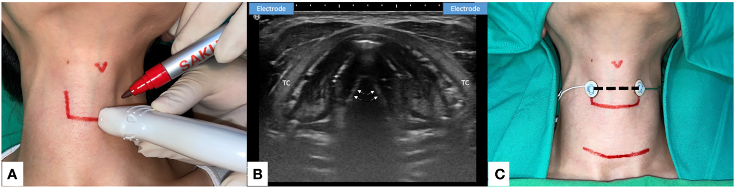 Transcutaneous Anterior Laryngeal Recording electrode placement for Intraoperative neural monitoring. (A) Preoperative skin marking: lateral border of thyroid cartilage and the level of true vocal fold. Precise localization may be done with the application of ultrasound (US). (B) The axial view of true vocal folds (white arrow). Lateral side of the thyroid cartilage (TC) lamina is the optimal location to place the skin surface electrodes (US illustration). (C) Transcutaneous recording electrodes are placed at the level of true vocal fold (dotted line). Transcutaneous recording method is applicable in small incision wound or remote thyroid surgery. Skin flap beneath the surface electrodes should be avoided.