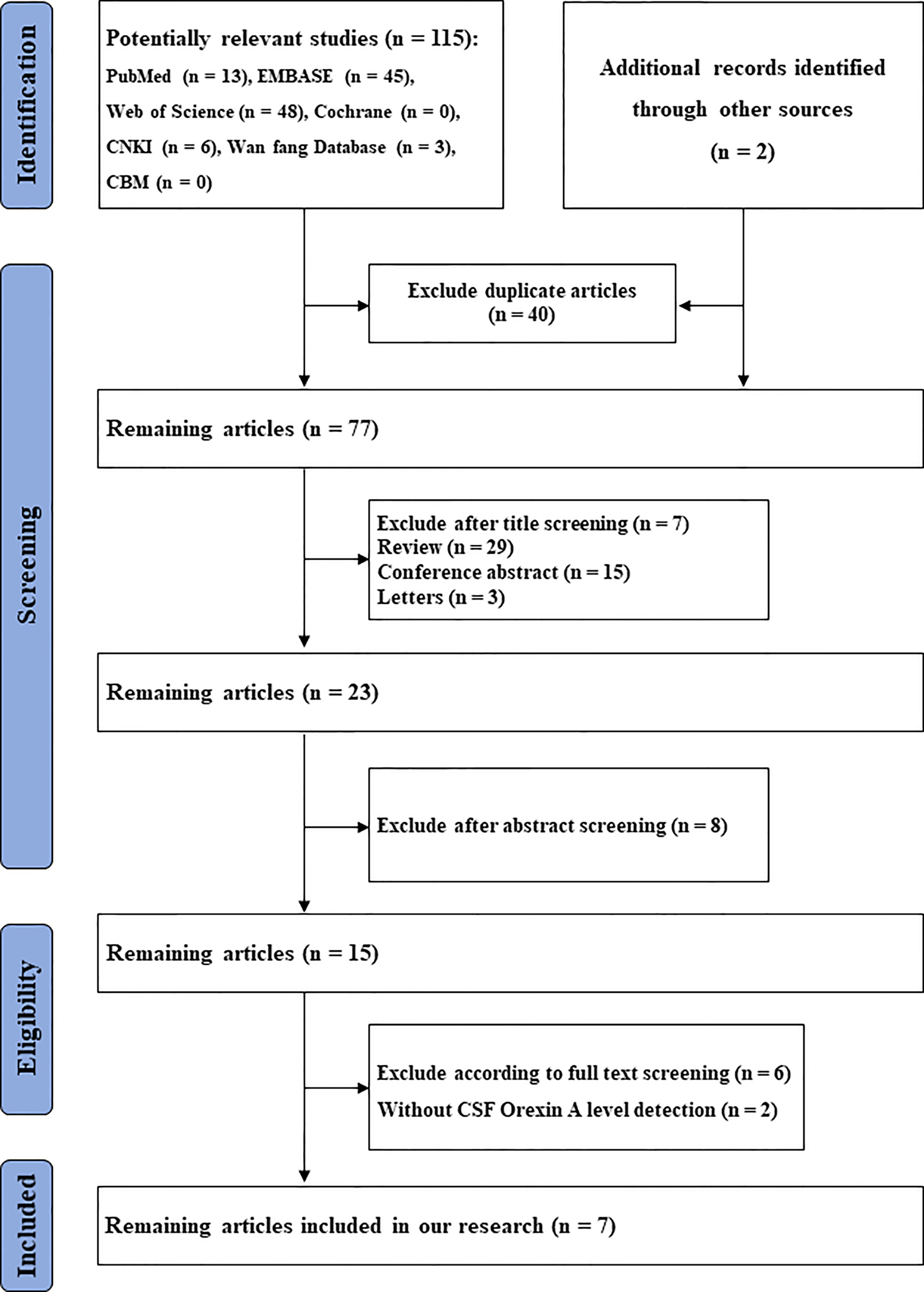 Similarly, studies were excluded if they met any of the following criteria: 1) no available CSF orexin-A data; 2) the publication was a letter, review, meta-analysis, or animal study; and/or 3) the orexin-A detection method differed from the guidelines.