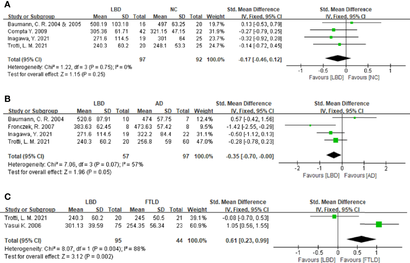 Forest plots of the CSF orexin-A levels in LBD compared with NCs/other diseases. (A) Forest plot of CSF orexin-A levels in LBD compared with NCs. (B) Forest plot of CSF orexin-A levels in LBD compared with AD. (C) Forest plot of CSF orexin-A levels in LBD compared with FTLD. CI, confidence interval; CSF, cerebrospinal fluid; LBD, Lewy body disease; NC, normal controls; AD, Alzheimer’s disease; FTLD, frontotemporal lobar degeneration.