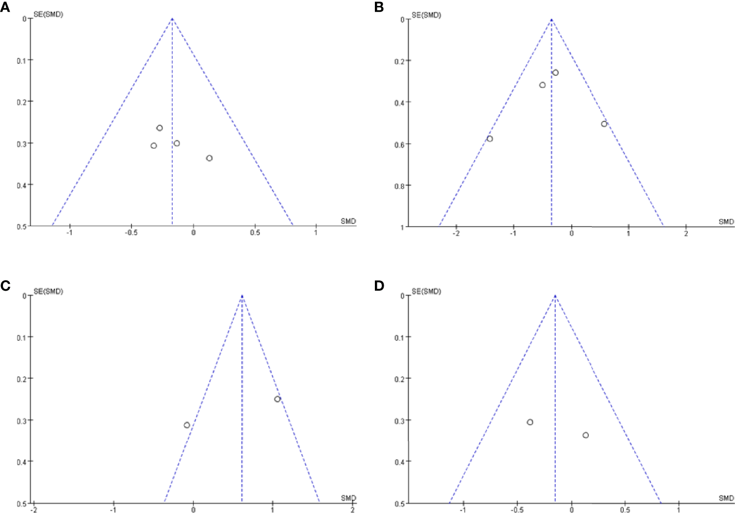 Publication bias was assessed using a visual inspection of funnel plots for each analysis. All showed relatively symmetrical distributions indicating a low risk of publication bias (Figures 4A–D).