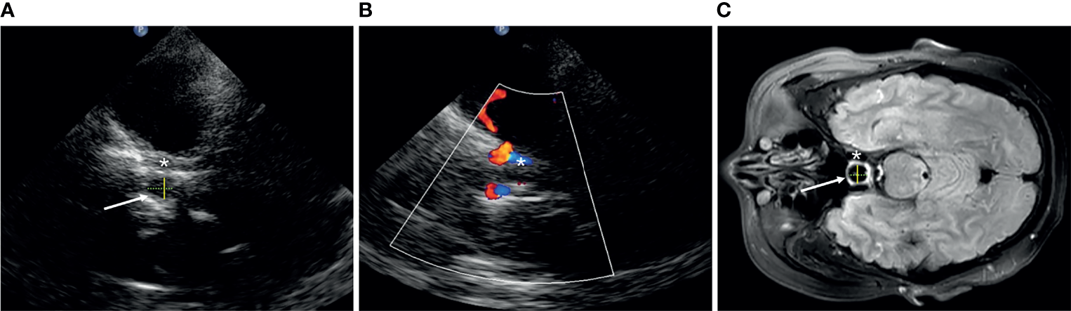The structure of Sella turcica (arrow) in transcranial sonography (A, B) and MRI (C). Asterisk, cavernous segment of the internal carotid artery; yellow solid line, D1; green dotted line, D2.