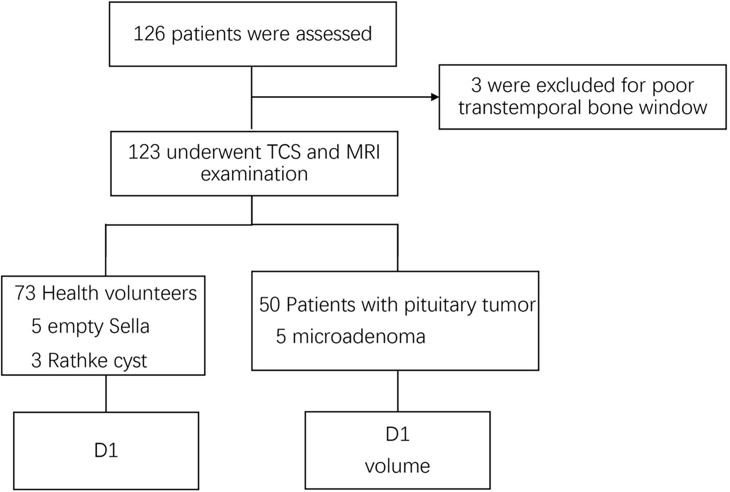 A total of 126 patients aged from 28 to 76, including 51 patients with pituitary tumor and 75 healthy volunteers, were recruited. Three patients (two volunteers and one patient) were excluded because of a poor transtemporal bone window (Figure 2). Therefore, a total of 123 patients were analyzed: 50 were patients with pituitary tumor and 73 were healthy volunteers (Tables 1, 2). The intra- and interoperator ICCs for the measurements of D1 and PV using TCS and MRI are 0.911 and 0.902 and 0.954 and 0.931, respectively.