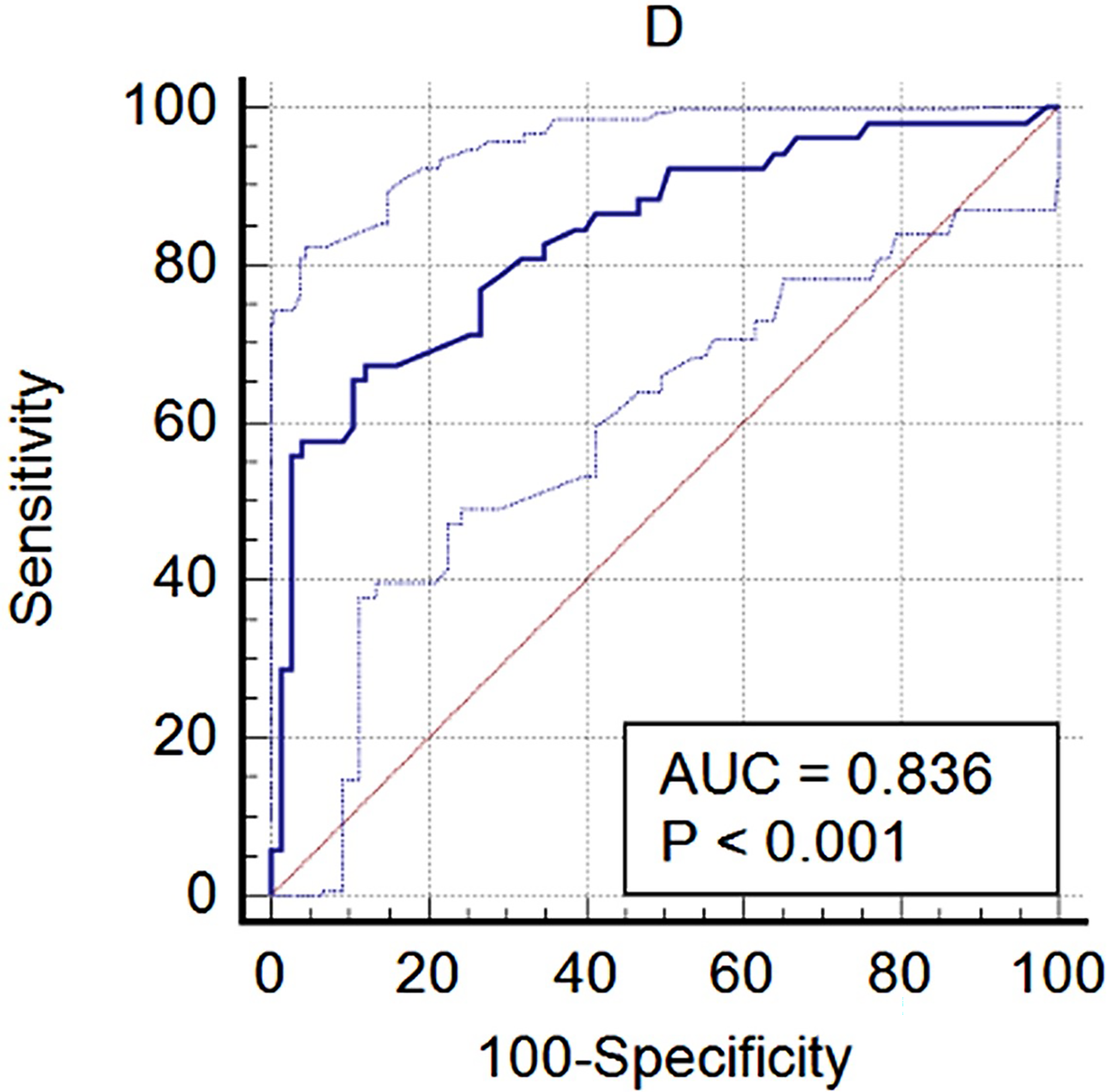D1 was used to predict pituitary tumor, and a ROC curve was delineated (Figure 4). In the ROC curve analysis, the area under the curve was 0.836, and the optimal cutoff value (1.56) exhibited a sensitivity and specificity of 67.31 and 88.0%, respectively.