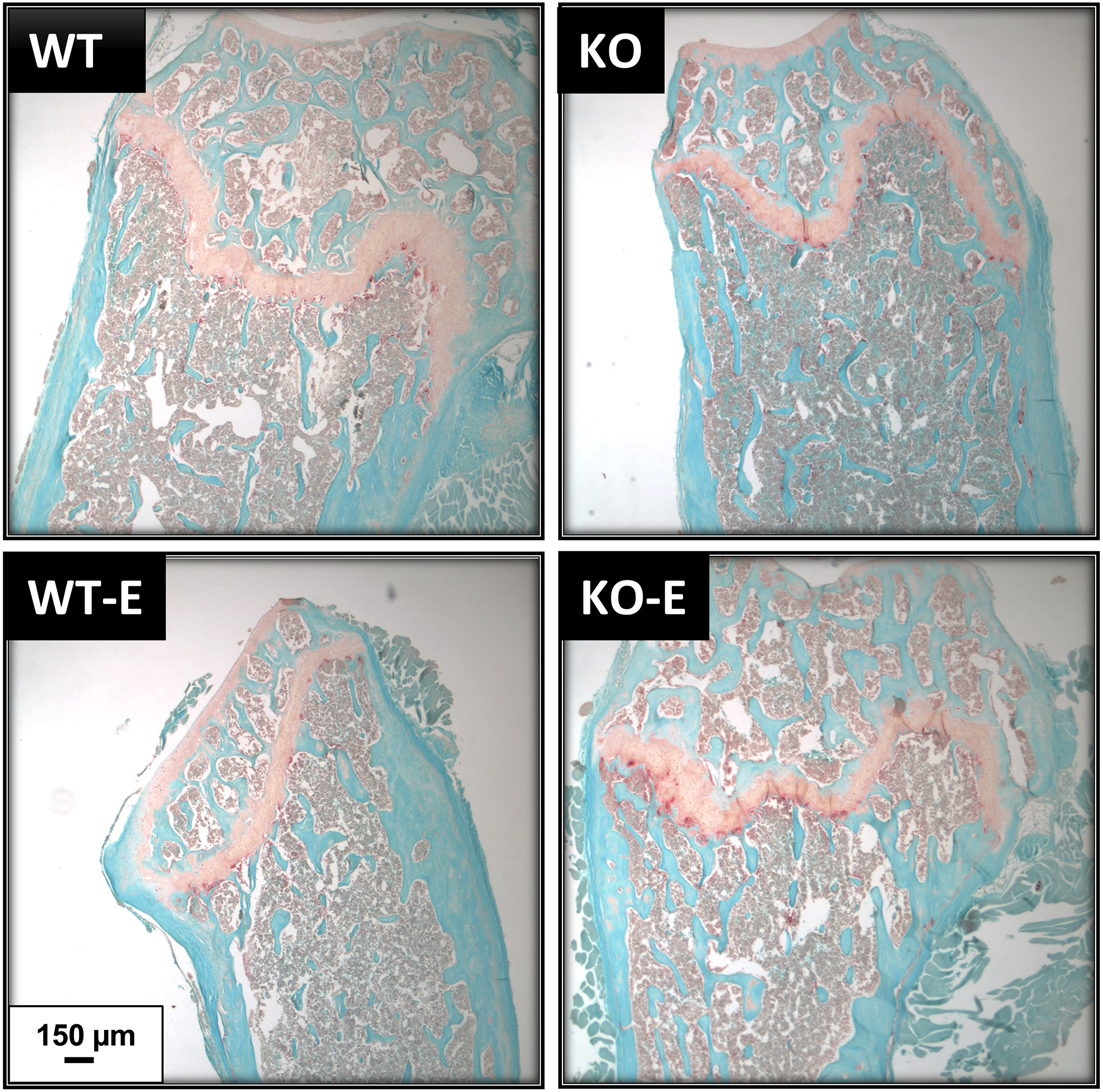 TRAP staining shows similar osteoclast numbers in WT and SEIPIN KO. Twelve-week-old male SEIPIN KO and WT were allocated to exercise (E) vs non-exercise controls for 6 weeks. Representative histologic sections of the distal femur were stained with Fast Green and TRAP, images via Olympus IX81.