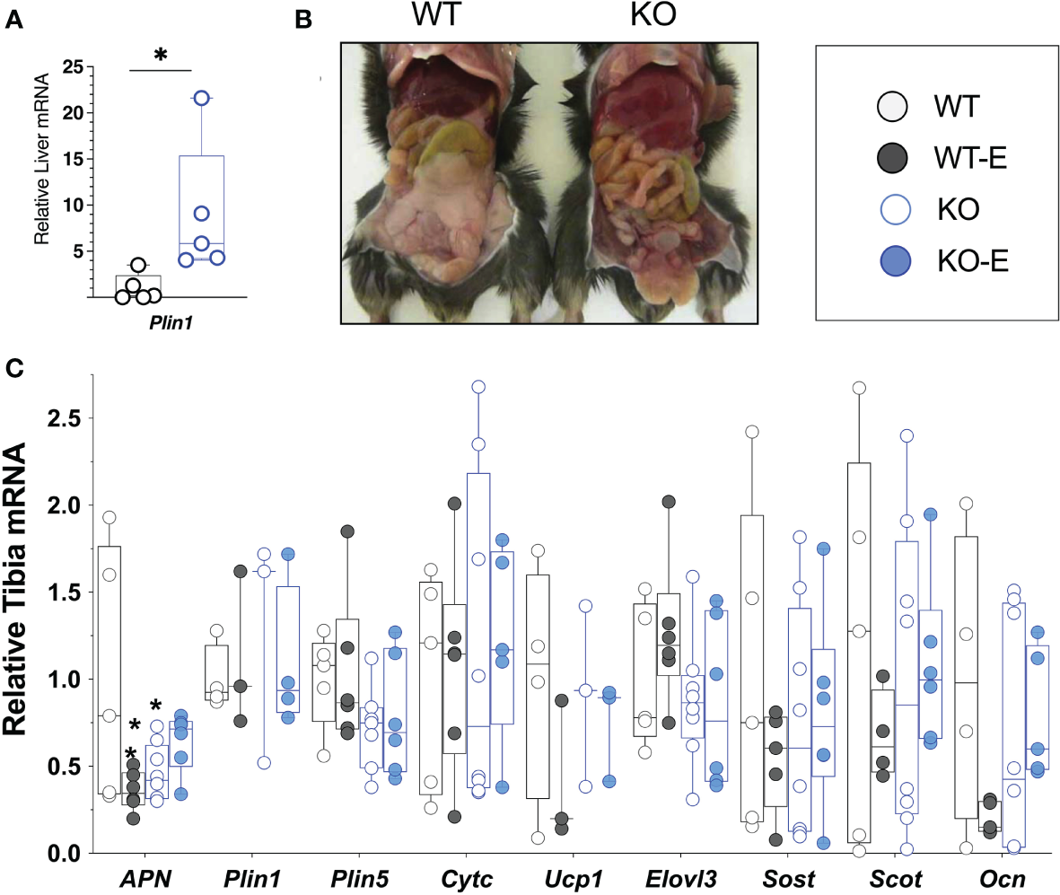 SEIPIN global KO demonstrate higher liver Plin1 expression, consistent with lipodystrophy. (A) Liver mRNA (N=5) via qPCR shows relative expression of Plin1.(B), Representative photo of KO and WT demonstrating lipodystrophic liver phenotype in KO. (C) Whole Tibia mRNA (N=4-8) via qPCR for metabolism, bone markers. Box and whisker plot, min to max with means. Between group differences as *p < 0.05 vs. WT.