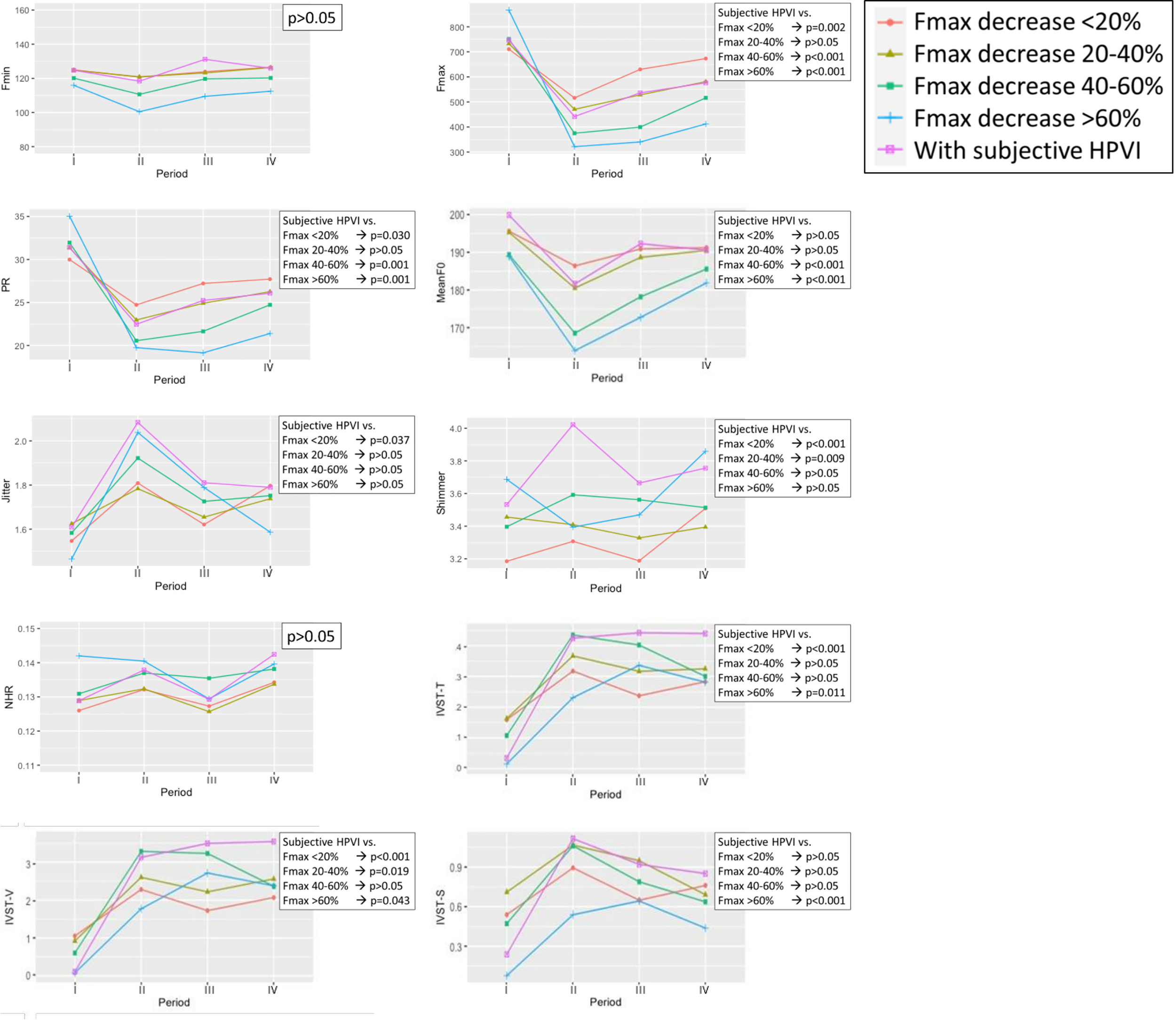 As the severity of objective HPVI increased, patients were significantly more to receive bilateral surgery (p=0.002) and have subjective HPVI (p<0.001), and there was no correlation with IVST scores. Among 211(27.2%) patients with subjective HPVI, patients were significantly more to receive bilateral surgery (p=0.003) and central neck dissection(p<0.001). These patients had very similar trends for Fmax, pitch range, and mean fundamental frequency as patients with 20-40% Fmax decrease (p>0.05) and had higher Jitter, Shimmer, and IVST scores than patients in any of the objective HPVI groups; subjective HPVI lasted until period-IV.