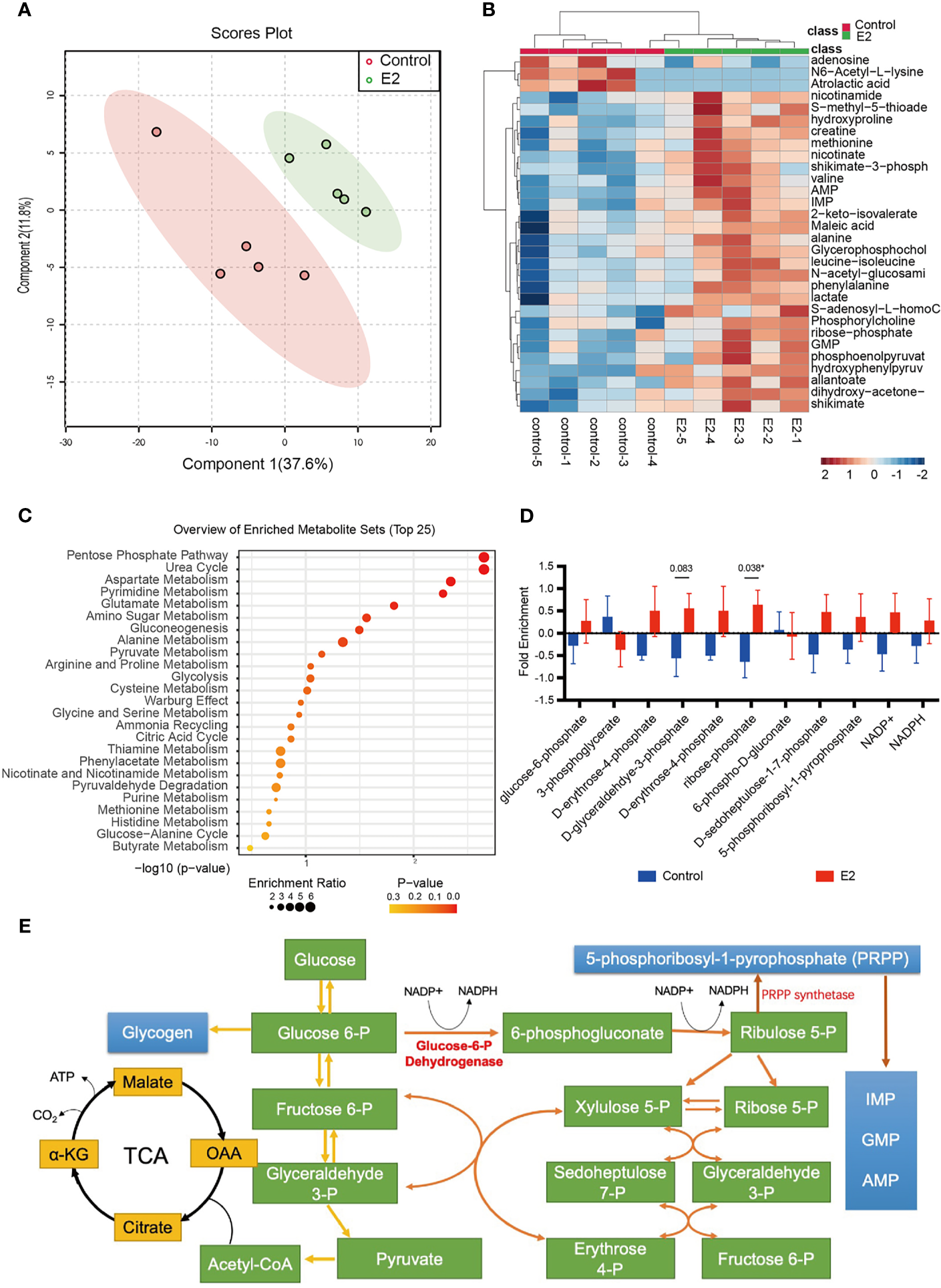The pentose phosphate pathway is promoted after estrogen treatment. (A) PCA score plot of Ishikawa cells with or without estrogen treatment. (B) Heat map showing metabolic changes in Ishikawa cells with or without estrogen treatment. (C) KEGG pathway enrichment analysis of the two groups. (D) The ratio of metabolic intermediates correlated to the PPP and glycolysis from Ishikawa cells with or without estrogen treatment (*p-value < 0.05). (E) Model depicting the action of PRPP between glucose metabolism and the nucleotide synthesis.