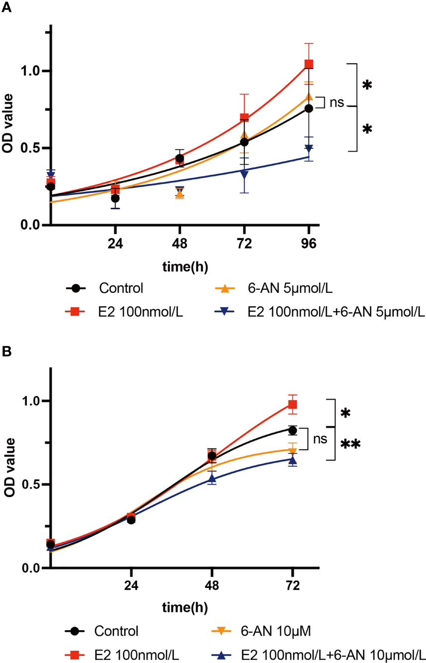 Estrogen affects cell proliferation via the pentose phosphate pathway. (A) Ishikawa cells were treated with 5 µM 6-AN; or 100 nM estrogen; or 100 nM estrogen along with 5 µM 6-AN; or DMSO for 0 h, 24 h, 48 h, 72 h, or 96 h, and cell proliferation was measured using a CCK8 kit. (B) Ishikawa cells were treated with 10 µM 6-AN; or 100 nM estrogen; or 100 nM estrogen along with 10 µM 6-AN; or DMSO for 0 h, 24 h, 48 h, or 72 h, and cell proliferation was measured using a CCK8 kit, *p-value < 0.05, **p-value < 0.01, n.s., not significant.