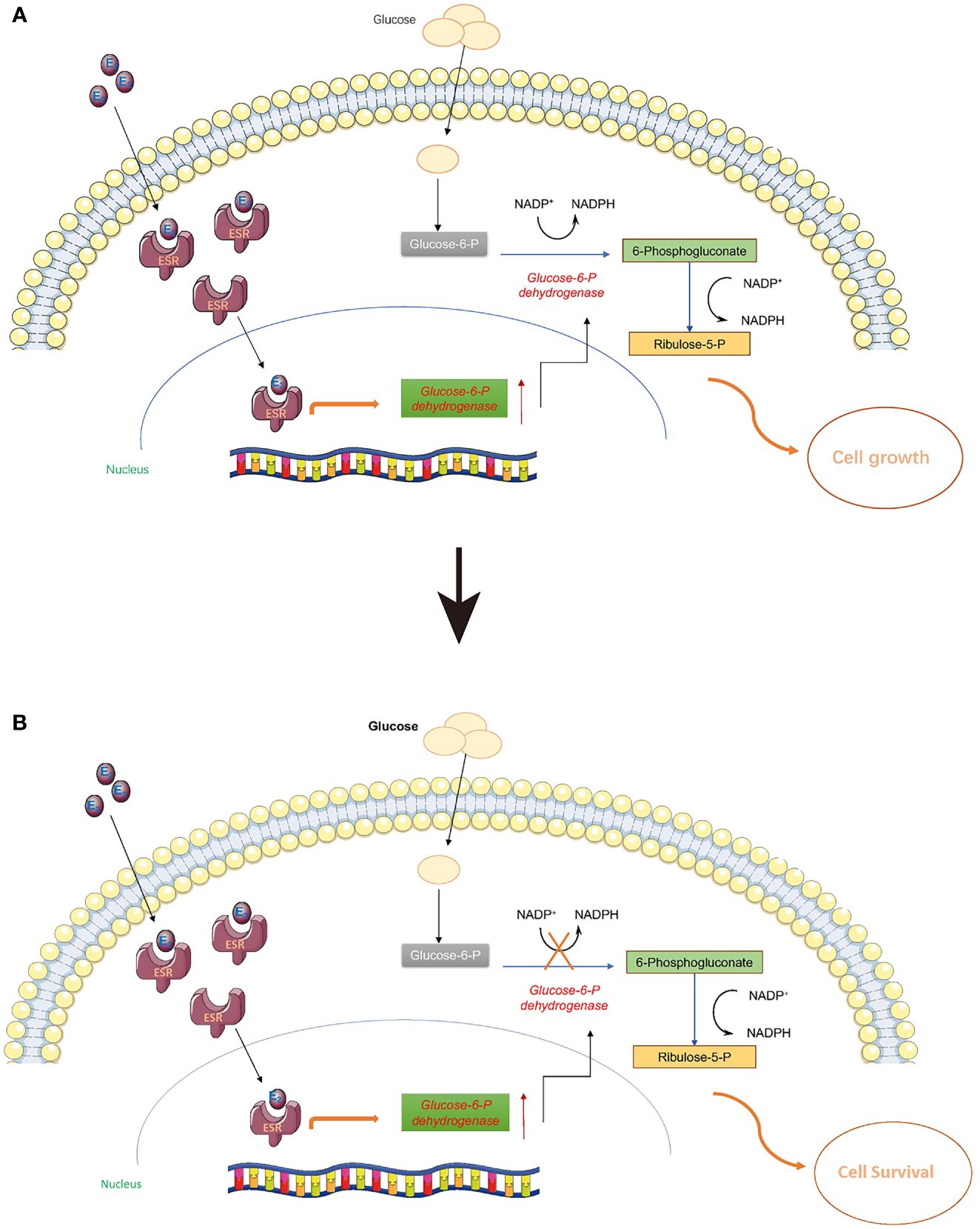 Normally, estrogen can enter cells and bind to estrogen receptors (ESR) so that it can be delivered to the nucleus as a complex to stimulate a cascade of biochemical reactions (Figure 4). It is widely known that ESR complexes can promote the expression of G6pd and the translation of glucose 6 phosphate dehydrogenase (G6PD) (51–53). G6PD is a critical enzyme in the conversion of glucose 6-phosphate to yield 6-phosphogluconate, and this biochemical reaction is also associated with one molecule of NADP+ being transformed to NADPH. Once the PPP is activated, de novo biosynthesis of nucleotides can largely supply the materials (deoxyribonucleic acid for DNA and ribonucleic acid for RNA) for cell proliferation (Figure 4A). However, when G6PD activity is inhibited with 6-AN, E2-ESR can promote the expression of G6PD without stimulating de novo biosynthesis of nucleotides. Cells might sense this signal of proliferation at an early time point, but without sufficient DNA and RNA, the cell cannot proliferate, or may even slow down the growth rate to preserve energy for cell survival (Figure 4B). Thus, we observed a decline in cell proliferation when 6-AN was added to the E2-treated cells (Figure 3).