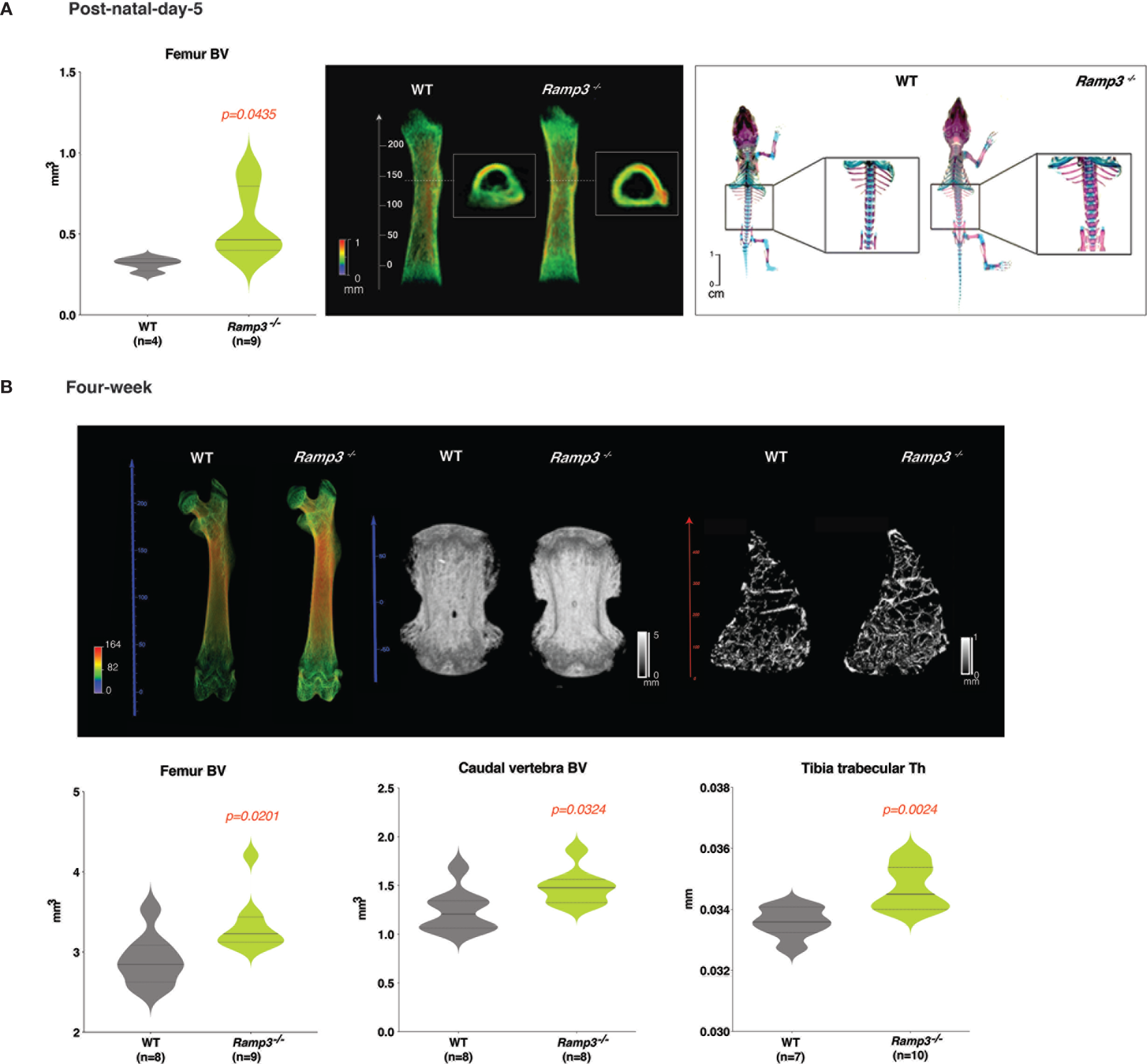 Figure 1 (A) MicroCT and skeletal staining reveals an advanced skeletal phenotype in the post-natal day 5 Ramp3-/- mice. Significant increase in the femur BV in Ramp3-/- mice (left) evidently observed in the 3D rendering of the femur bone (middle) (heat map scale: blue = low, red=high). Skeletal staining (right) reveals a remarkable increase in the bone formation in the vertebrae and long-bones in Ramp3-/- mice. (B) MicroCT reveals increase in whole femur and caudal vertebral bone volume in both the 3D bone renderings (top) and quantitative measurements (bottom) at 4 weeks of age. Trabecular analysis at a higher resolution identifies an increase in the trabecular thickness in the tibiae in both, the 3D models (top) and quantifications (bottom) in the Ramp3-/- mice. (Heat map scales in 3D models: Coloured scale- blue=low and red=high; Black and White scale – black = low and white= high).