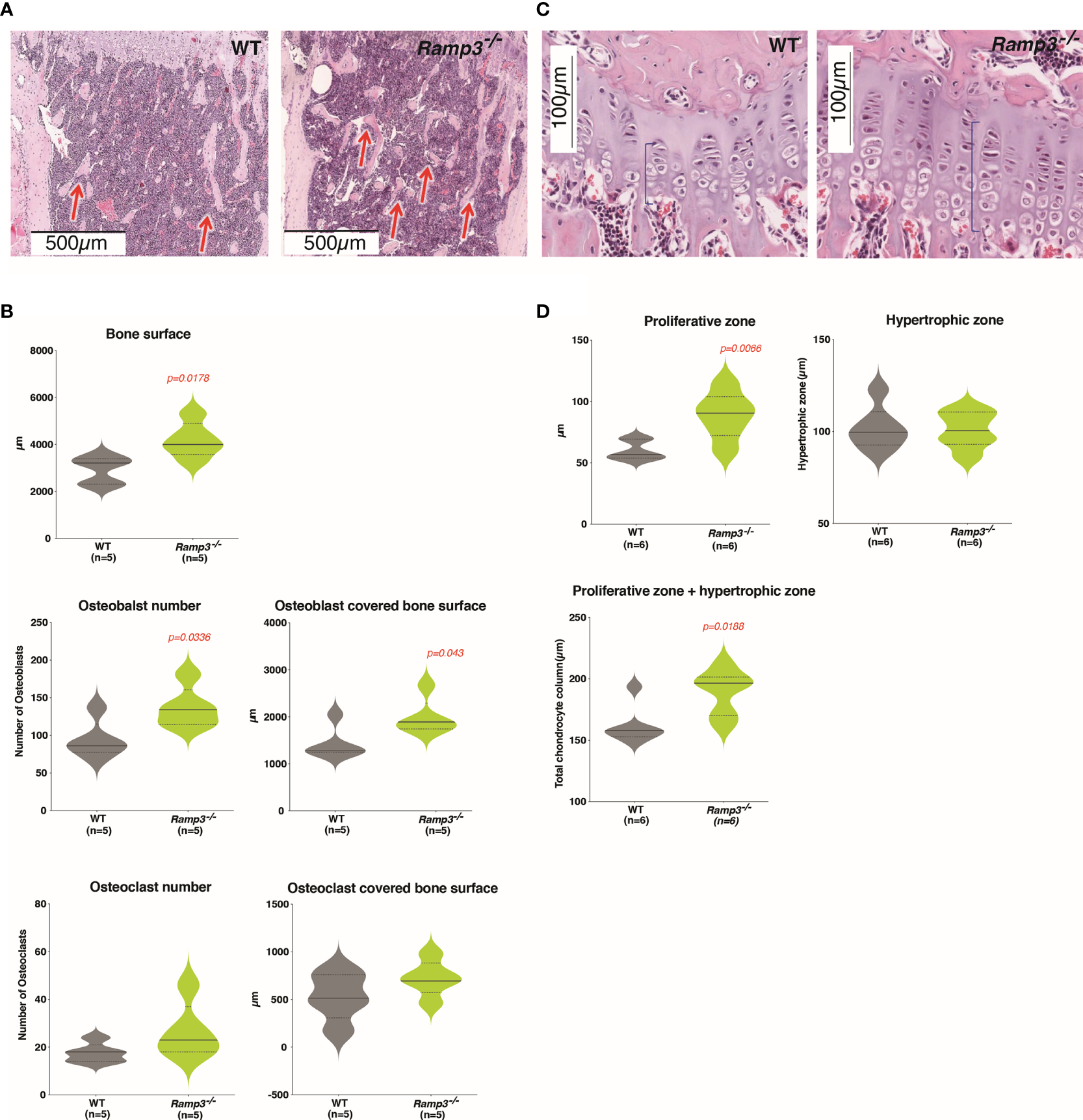Figure 4 (A) Haematoxylin and eosin-stained tibia sections reveal increased trabecular bone (red arrows) in the Ramp3-/- mice at 8 weeks of age. (B) Histological measurements identify increase in the bone surface, osteoblast number and osteoblast covered bone surface (top) in the Ramp3-/- mice. No differences in the osteoclast numbers and osteoclast covered bone surface (bottom) identified. (C) Haematoxylin and eosin-stained tibia sections of the growth plate show increase in the growth plate thickness (blue brace brackets). (D) Quantitative analysis of the growth plate reveals that the proliferative zone, but no the hypertrophic zone contributes to the gross increase in the growth plate thickness.