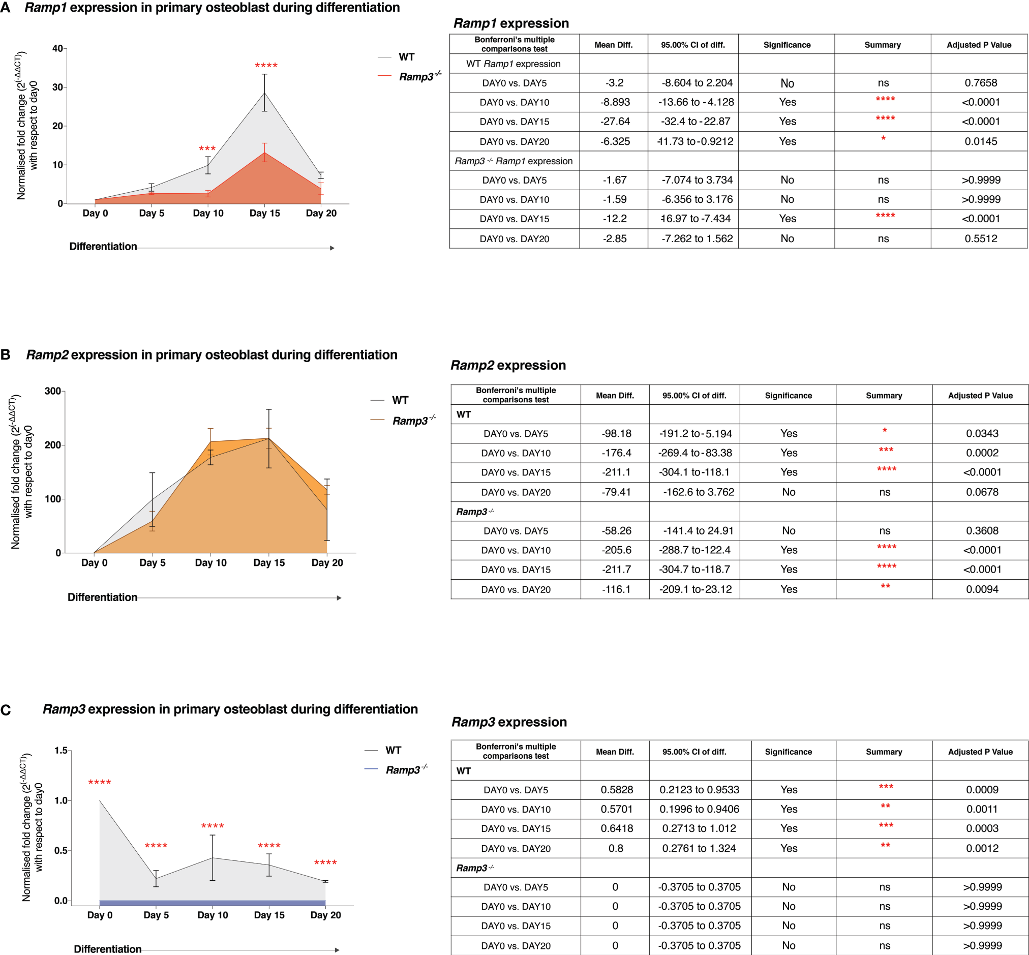Figure 5 Quantitative PCR expression of Ramp1 (A), Ramp2 (B) and Ramp3 (C) in Ramp3-/- and WT differentiating osteoblast cultures. Level of significance for the difference in gene expression between the genotypes is indicated with the number of asterisks (adjusted p value 0.05=*, p value 0.001 = **, p value 0.0001 = ***, p value 0.00001 = ****). The tables adjacent to the plots summarise the mean differences, 95% confidence intervals and adjusted p value post ANOVA test and the post-hoc Bonferroni’s correction. ns, Not significant.