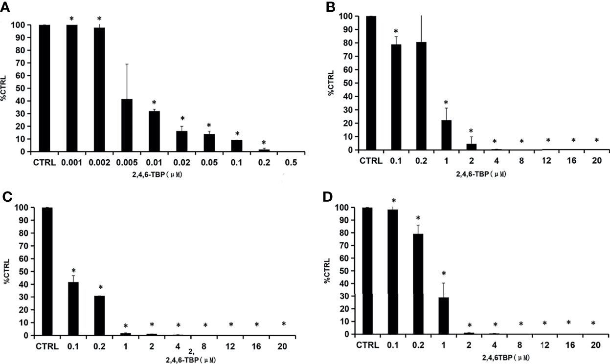 Concentration-dependent inhibition of 2,4,6-TBP towards SULTs. (A–D) presents concentration-dependent inhibition of 2,4,6-TBP towards SULT1A1 (A), SULT1A3 (B), SULT1B1 (C) and SULT1E1 (D).The data were given as mean value plus S.D. (n=3). *p < 0.05.