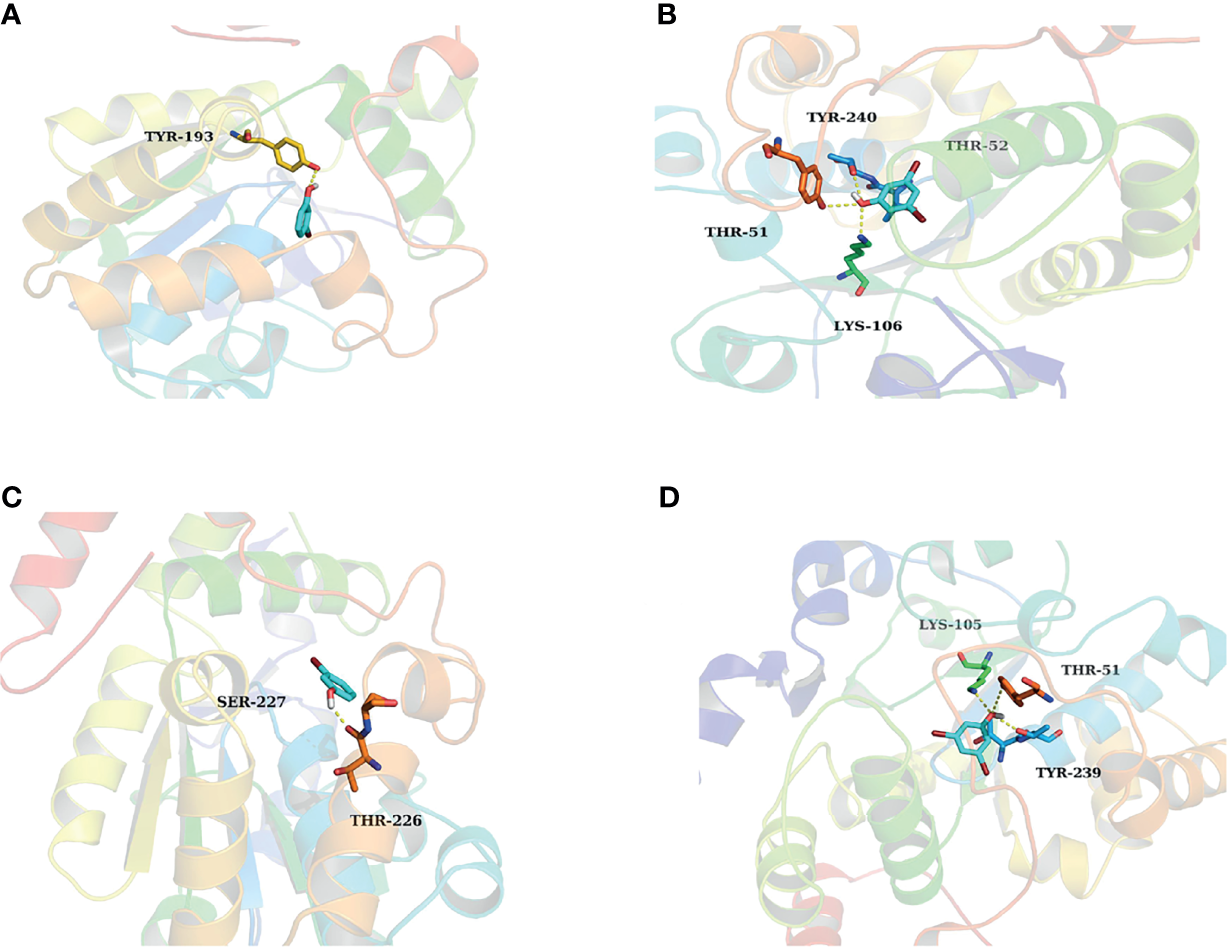 The activity cavity of between 3-BP, 3,5-DBP and SULT1A3, SULT1E1. 3-BP formed 1 hydrogen bond with SULT1A3 (A) and SULT1E1 (C), respectively. 3,5-DBP formed 3 hydrogen bonds with SULT1A3 (B) and SULT1E1 (D), respectively.