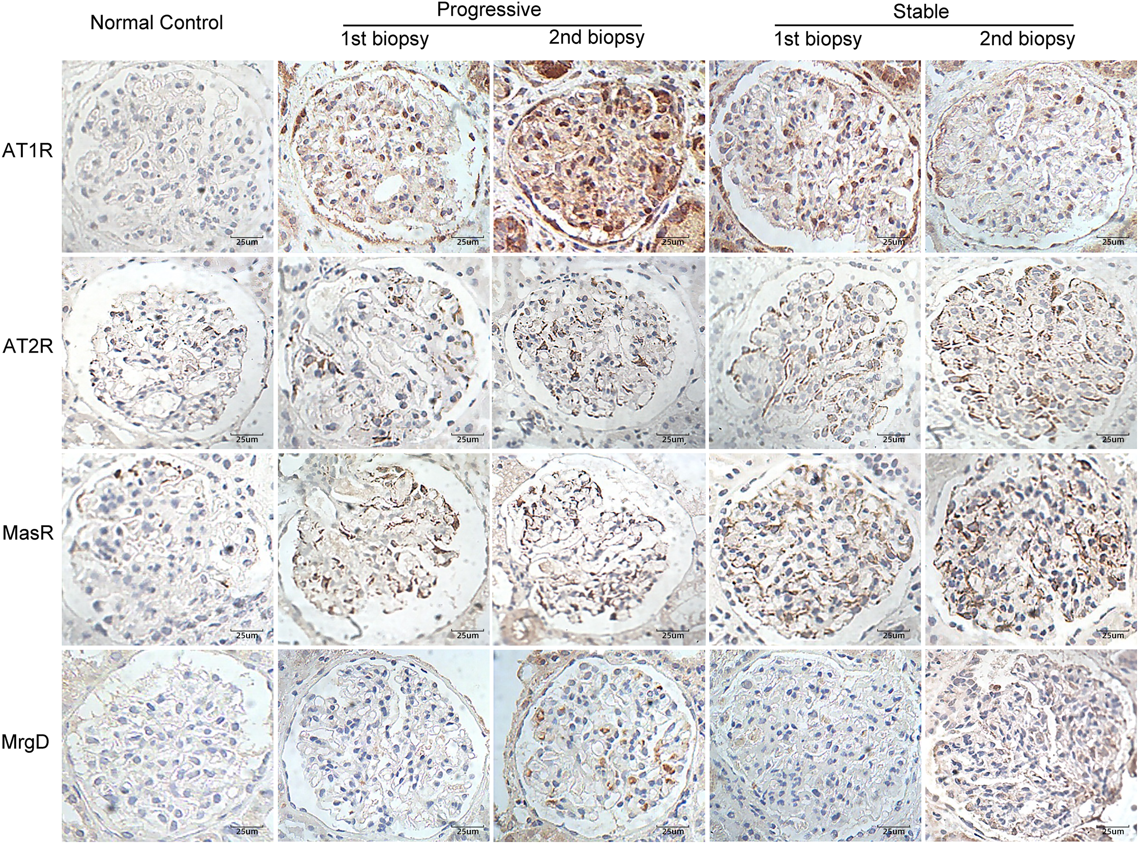 Immunohistochemical staining for AT1R, AT2R, MasR, and MgrD in patients with IgA nephropathy in the stable and progressive groups (×400). AT1R, angiotensin II type 1 receptor; AT2R, angiotensin II type 2 receptor; MasR, Mas receptor; MgrD, Mas-related G protein-coupled receptor, member D.