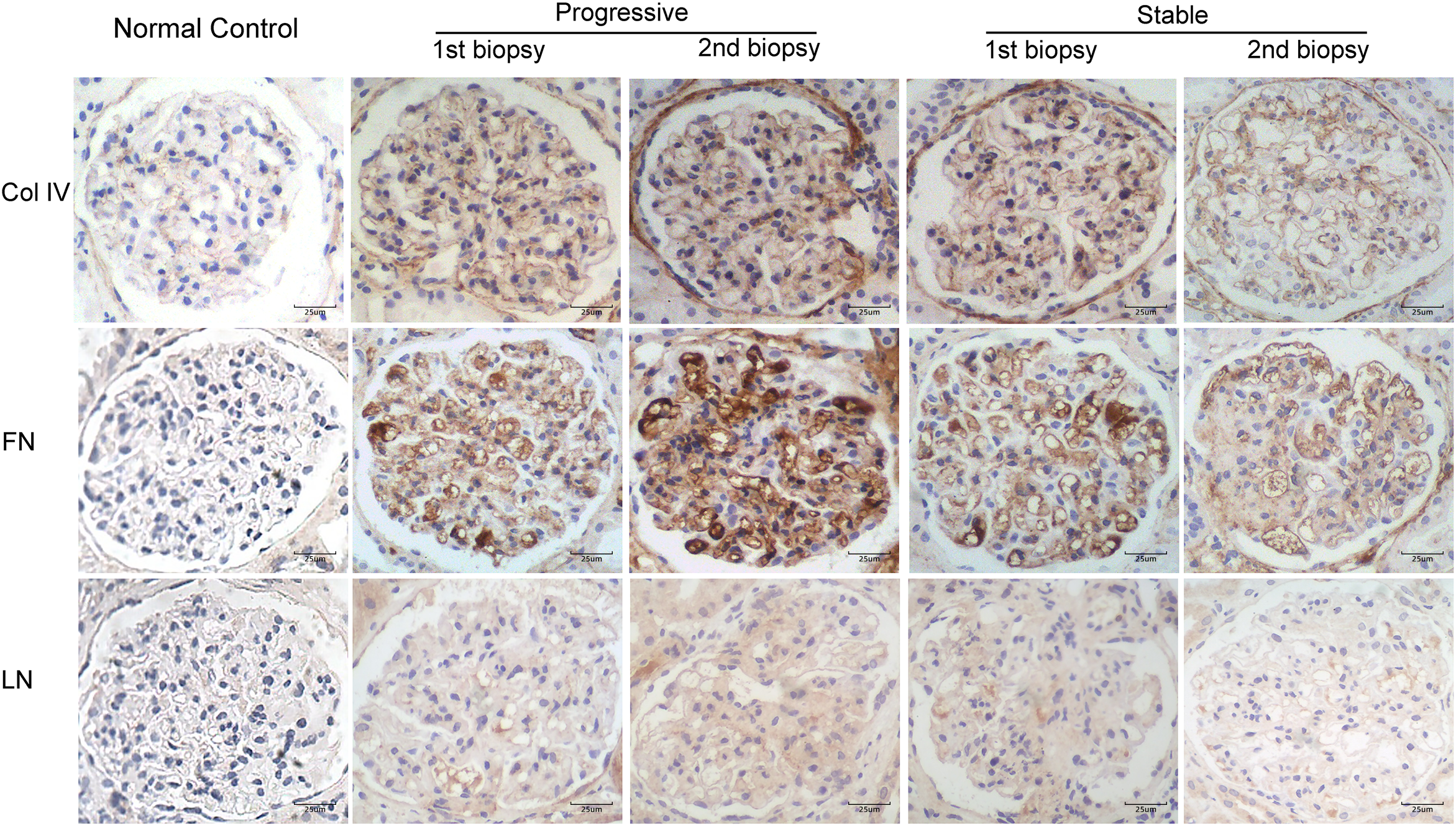 Immunohistochemical staining for Col IV, FN, and LN in patients with IgA nephropathy in the stable and progressive groups (×400). Col IV, collagen IV; FN, fibronectin; LN, laminin.