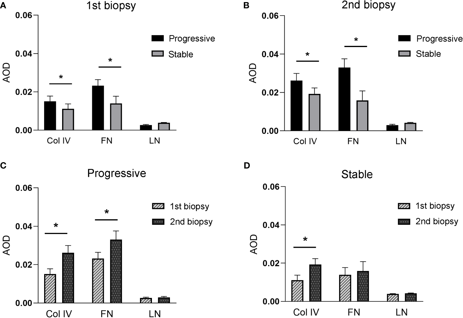 (A, B), indicates the expression of Col IV, FN, and LN between stable and progressive groups at the first (A) or second (B) renal biopsy. (C, D), indicates the expression of Col IV, FN, and LN between the first and second biopsies in the progressive (C) or stable (D) groups.