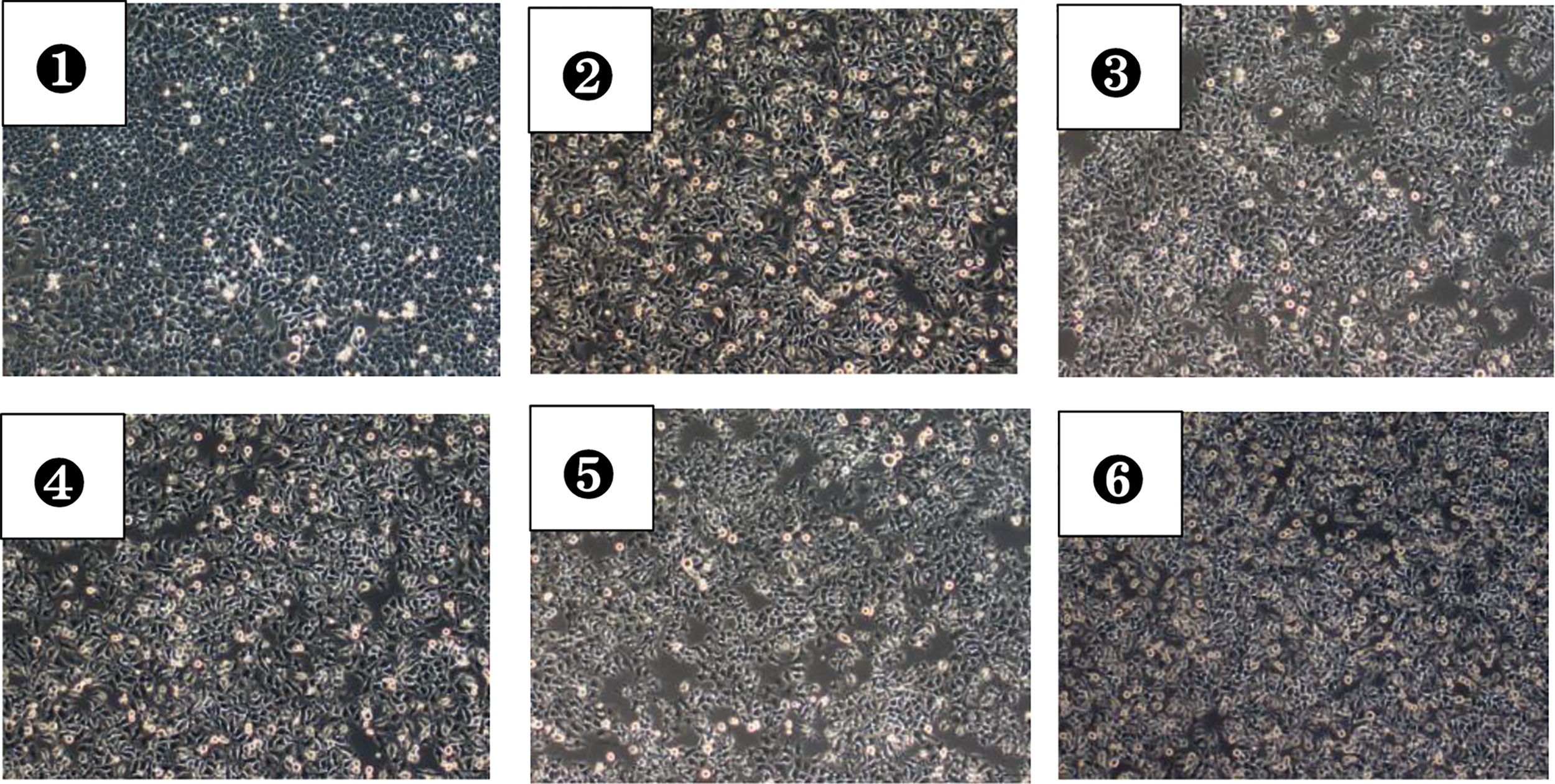 HepG2 cells in each group after 48 hours of culture (magnification, ×100). ①A photo of cell growth in the HepG2 group; ②A photo of cell growth in the HepG2+VAT group; ③A photo of cell growth in the HepG2+SAT group; ④A photo of cell growth in the HepG2+VAT+EXE group; ⑤A photo of cell growth in the HepG2+SAT+EXE group; ⑥A photo of cell growth in the HepG2+TritonX-100 group.