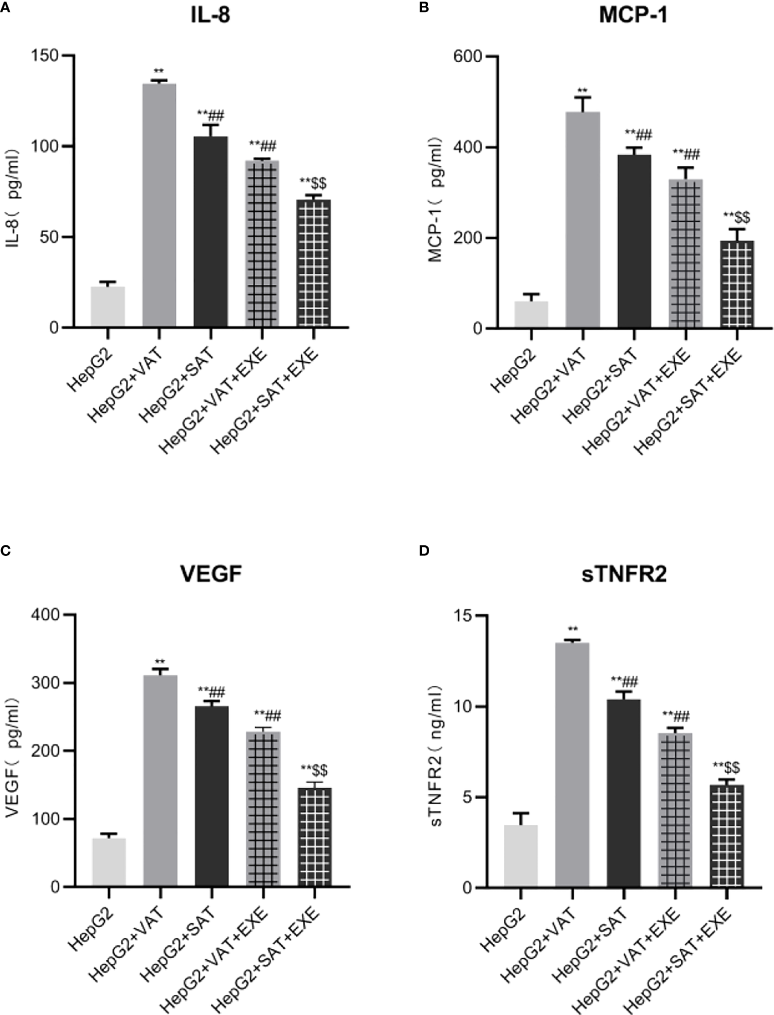 Exenatide inhibits adipokines secreted by adipose tissue at different sites. (A)The content of IL-8 in the supernatant of each group. (B) The content of MCP-1 in the supernatant of each group. (C) The content of VEGF in the supernatant of each group. (D) The content of sTNFR2 in the supernatant of each group. Data are means ± SEM, n = 3/group, **P < 0.01 vs. HepG2 group; ##P < 0.01 vs. HepG2+VAT group; $$P < 0.01 vs. HepG2+SAT group.