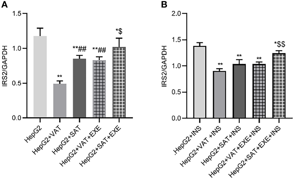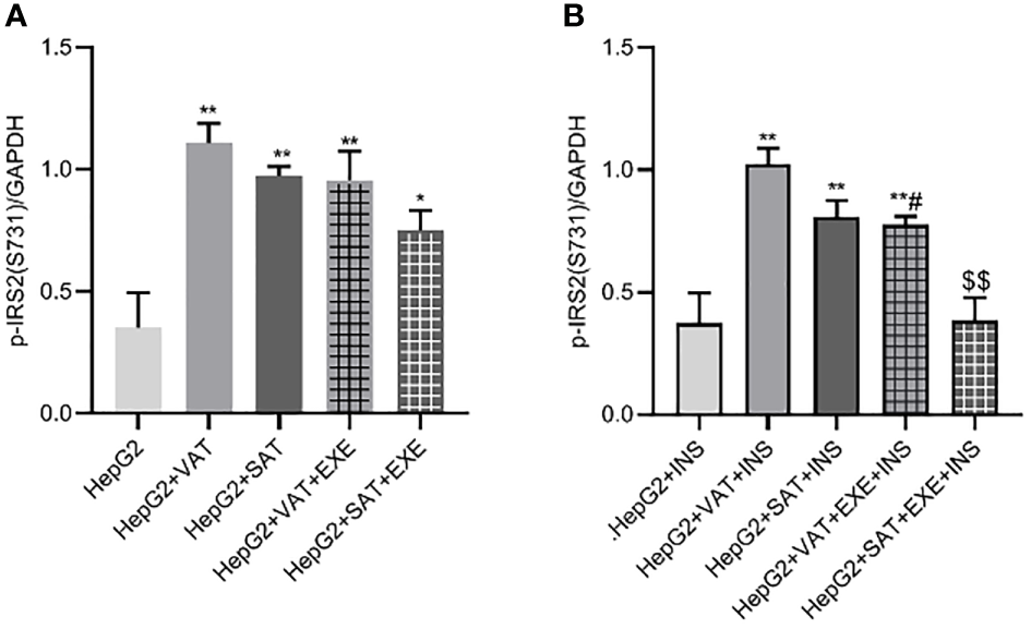 To further explore the effect of insulin on IRS2 protein, we added insulin to each co-culture group. Compared with HepG2+insulin group, the expression of IRS2 protein in HepG2+VAT+insulin group, HepG2+SAT+insulin, HepG2+VAT+EXE+insulin group and HepG2+SAT+EXE+insulin group was decreased(p<0.05). Compared with HepG2+VAT+insulin group, the expression of IRS2 in HepG2+SAT+insulin group was higher, but the difference was not statistically significant (0.90 ± 0.05/GAPDH vs. 1.04 ± 0.08/GAPDH, p>0.05). The expression of IRS2 protein in HepG2+VAT+insulin group was lower than that in HepG2+VAT+EXE+insulin group, but there was also no statistical difference (0.90 ± 0.05/GAPDH vs. 1.03 ± 0.04/GAPDH, p>0.05). Compared with HepG2+SAT+insulin group, the expression of IRS2 protein in HepG2+SAT+EXE+insulin group was significantly increased (1.04 ± 0.08/GAPDH vs. 1.24 ± 0.05/GAPDH, p<0.01) (Figure 5B).