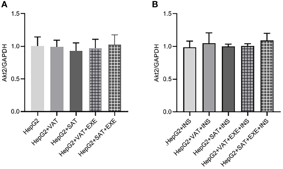 There was no significant difference in Akt2 protein expression between HepG2 group, HepG2+VAT group, HepG2+SAT group, HepG2+VAT+EXE group, and HepG2+SAT+EXE group (Figure 8A).