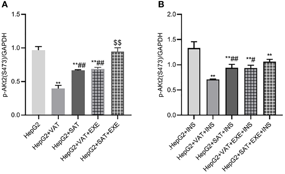 To further explore the effect of insulin on p-Akt2(S473) protein, we added insulin to each co-culture group. Compared with HepG2+insulin group, the expression of p-Akt2(S473) protein in HepG2+VAT+insulin group, HepG2+SAT+insulin, HepG2+VAT+EXE+insulin group and HepG2+SAT+EXE+insulin group was decreased (p<0.01). Compared with HepG2+VAT+insulin group, the expression of p-Akt2(S473) in HepG2+SAT+insulin group was higher (0.71 ± 0.01/GAPDH vs. 0.94 ± 0.07/GAPDH, p<0.01). The expression of p-Akt2(S473) protein in HepG2+VAT+insulin group was lower than that in HepG2+VAT+EXE+insulin group (0.71 ± 0.01/GAPDH vs. 0.93 ± 0.06/GAPDH, p<0.05). Compared with HepG2+SAT+insulin group, the expression of p-Akt2(S473) protein in HepG2+SAT+EXE+insulin group was no statistical difference (0.94 ± 0.07/GAPDH vs. 1.06 ± 0.05/GAPDH, p>0.05) (Figure 9B).