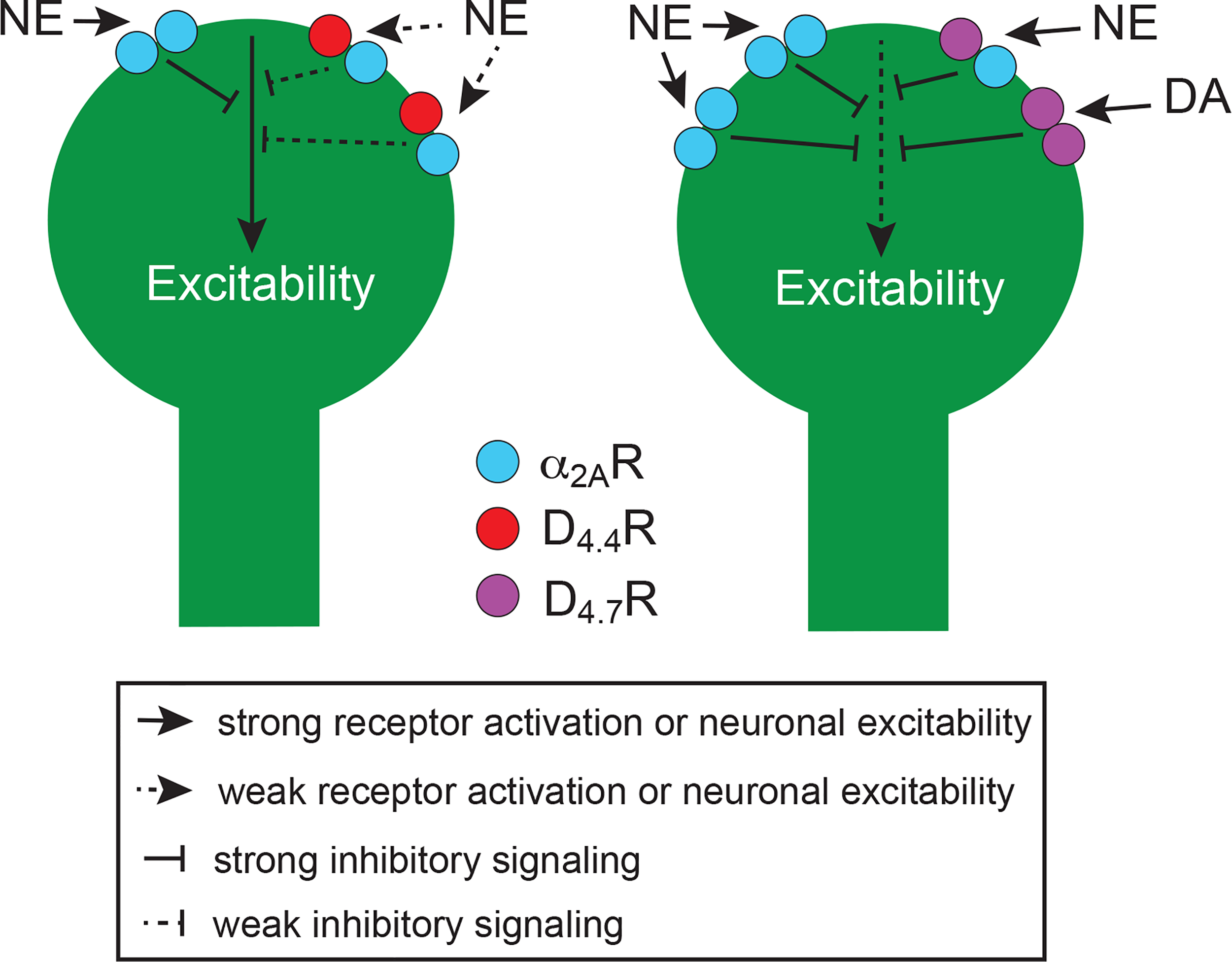 Figure 2 Schematic representation of the perisomatic region of frontal cortical P neurons and their modulatory D4.4Rs (left neuron) and D4.7Rs (right neuron), which form heteromers with α2ARs. Heteromerization of α2AR with D4.7R promotes a gain of function of the noradrenergic-mediated inhibition of neuronal excitability, as compared with heteromerization with D4.4R, since it increases the potency of norepinephrine (NE). In addition, high concentrations of NE promote a decrease in the potency of NE in the α2AR-D4.4R but not in the α2AR-D4.7R heteromer (see text). Furthermore, the population of D4.7Rs not forming heteromers with α2AR is larger than with D4.4Rs, which also increases the population of α2AR not forming heteromers and therefore the potency of NE to decrease neuronal excitability. The increased proportion of D4.7Rs not forming heteromers additionally increases the ability of DA to decrease neuronal excitability. The scheme is based on results obtained from experiments in mammalian transfected cells and from in vitro experiments in rodents (see text).