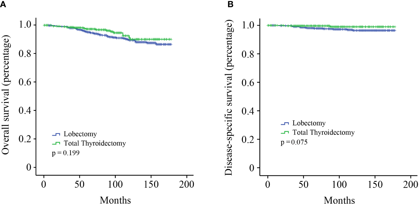 The cohort was categorized into two groups to investigate the effect of different surgical modalities on stage I MTC patients: lobectomy and total thyroidectomy. Kaplan–Meier survival analysis showed that no significant survival difference for OS was observed between the two groups (Figure 1A, p = 0.199). DSS in patients who underwent total thyroidectomy seemed to be better than those undergone lobectomy, although not reaching statistical significance (Figure 1B, p = 0.075).