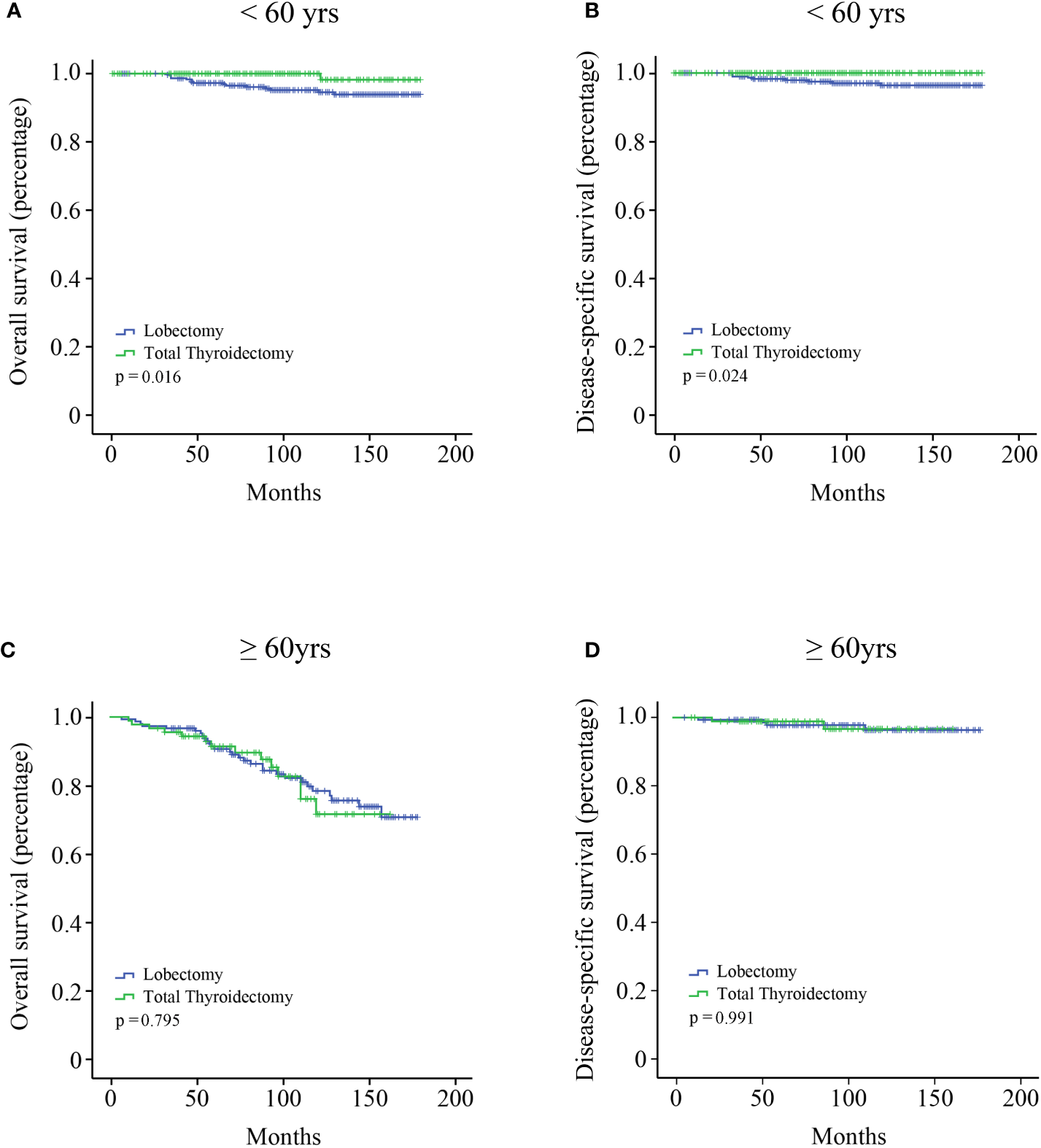 Kaplan–Meier survival analysis according to the age subgroups. (A) OS curve of stage I MTC patients under the age of 60 years; (B) DSS curve of stage I MTC patients under the age of 60 years; (C) OS curve of stage I MTC patients above the age of 60 years; (D) DSS curve of stage I MTC patients above the age of 60 years.