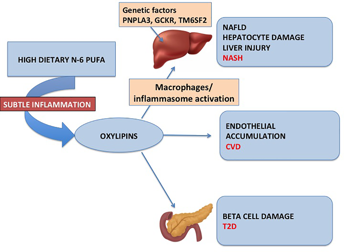 The data present in the literature about the role of n-6 PUFA in the pathogenesis of NAFLD and T2D clearly suggest that therapeutic efforts should be conducted to reduce plasmatic n-6 PUFA and possibly to reduce n-6 PUFA intake in order to prevent those diseases.
