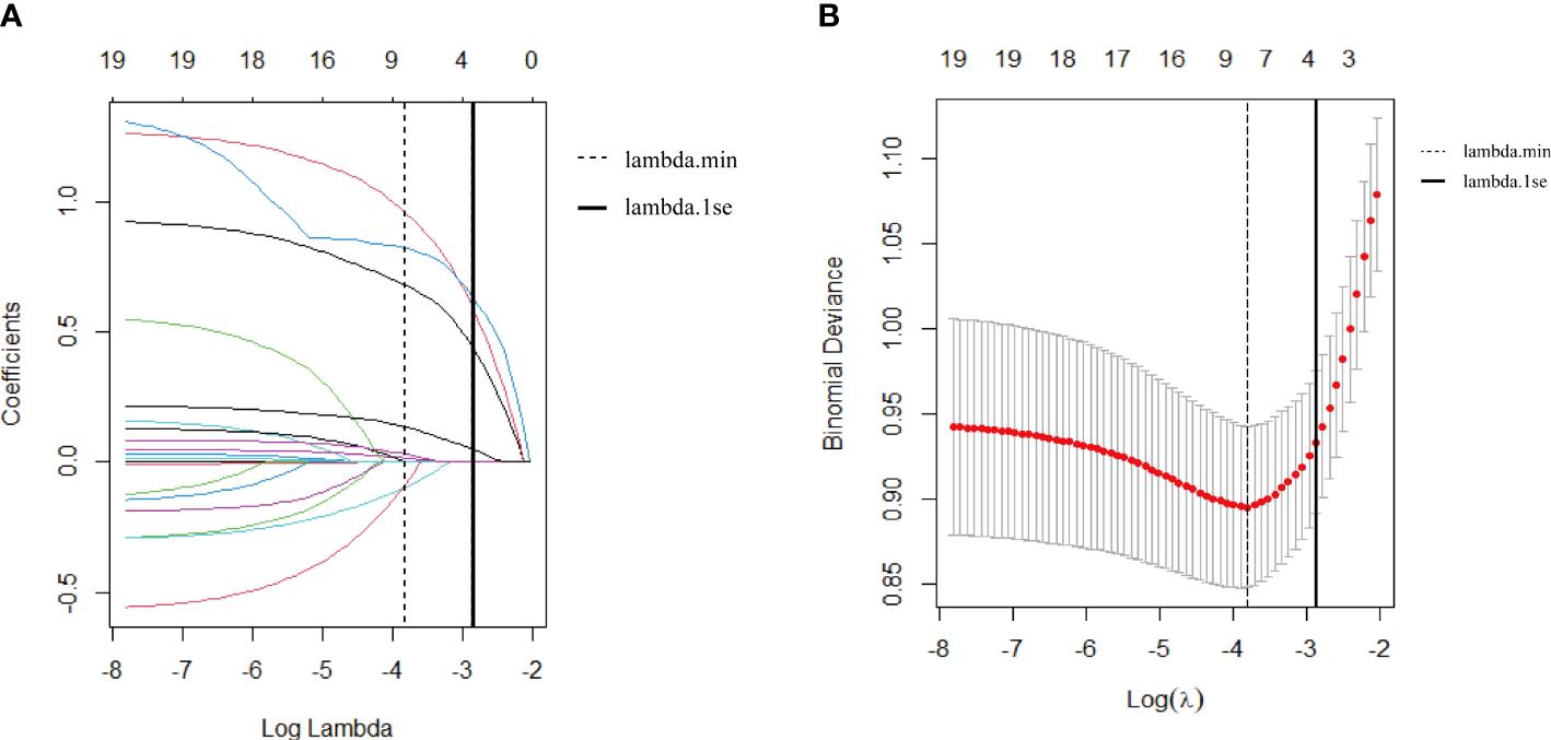(A) Feature selection via the least absolute shrinkage and selection operator (LASSO) regression model. (A) The LASSO coefficient profiles of 19 features. The coefficient profile plot was conducted against the log (lambda, λ) sequence. The dotted vertical line was drawn at the lambda with a minimum mean squared error (lambda.min); nine features were selected by the LASSO regression. The solid vertical line was drawn at the lambda.min with one standard error (lambda.1se); four features were selected by the LASSO regression model. (B) Feature selection via 10-fold cross-validation. (B) The optimal parameter (lambda, λ) selection in the Lasso regression model used 10-fold cross-validation via the minimum criteria. The partial likelihood deviance (binomial deviance) curve was plotted versus logλ. The dotted vertical line was drawn at the lambda with a minimum mean squared error (lambda.min); nine features were selected. The solid vertical line was drawn at the lambda.min with one standard error (lambda.1se); four features were selected.