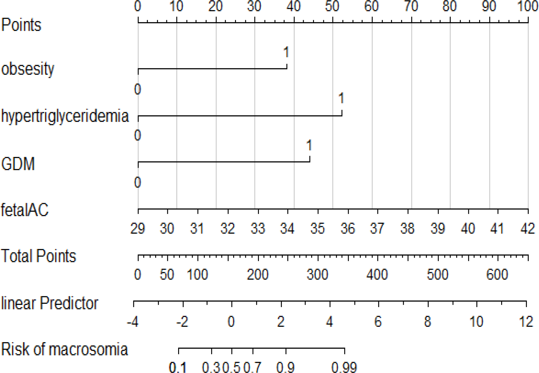 A nomogram prediction model of macrosomia. Four predictors were included: the prepregnancy obesity, hypertriglyceridemia, GDM, and fetal abdominal circumference. The score of each predictor were determined from each feature axis to the total points axis by following the vertical line. GDM, gestational diabetes mellitus; fetal AC, fetal abnormal circumference.
